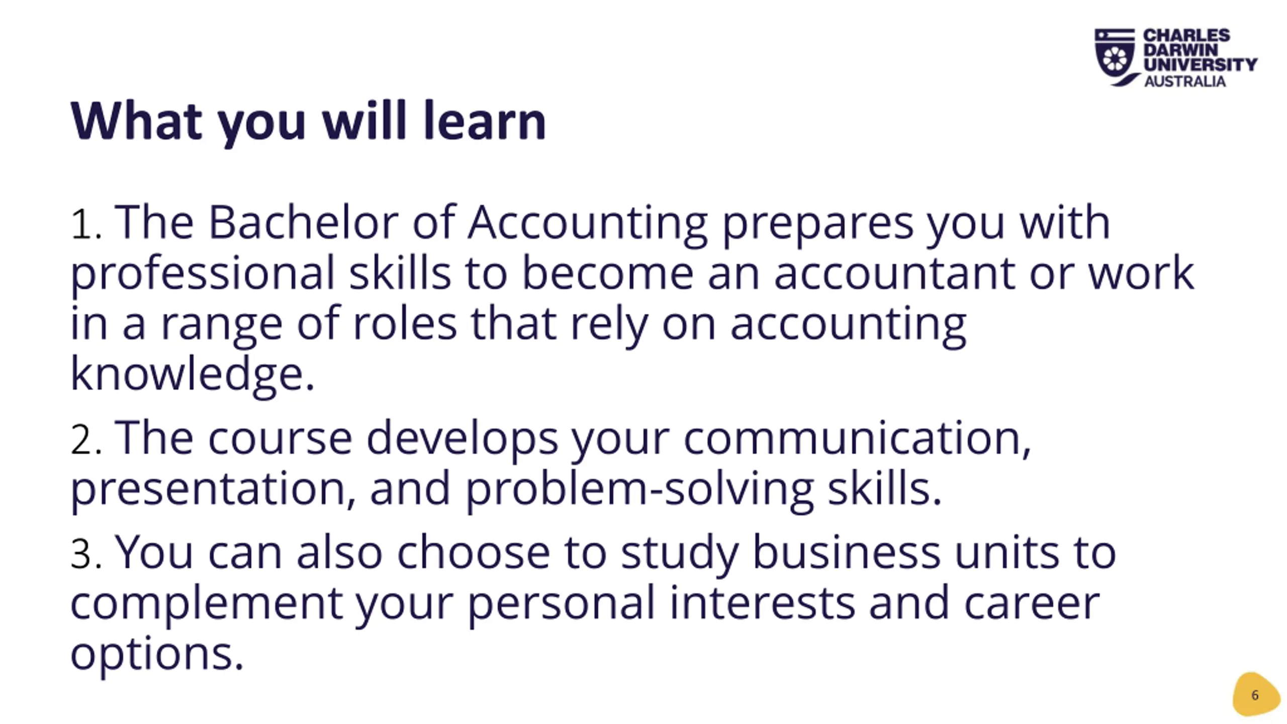 What you will learn 1. The Bachelor of Accounting prepares you with professional skills to become an accountant or work in a range of roles that rely on accounting knowledge. 2. The course develops your communication, presentation, and problem-solving skills. 3. You can also choose to study business units to complement your personal interests and career options. 6