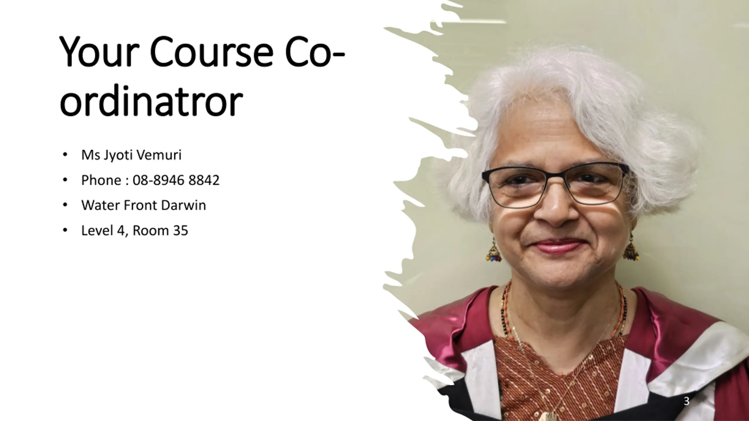 Your Course Co Your Course Co- - ordinatror ordinatror Ms Jyoti Vemuri Phone : 08-8946 8842 Water Front Darwin Level 4, Room 35 3