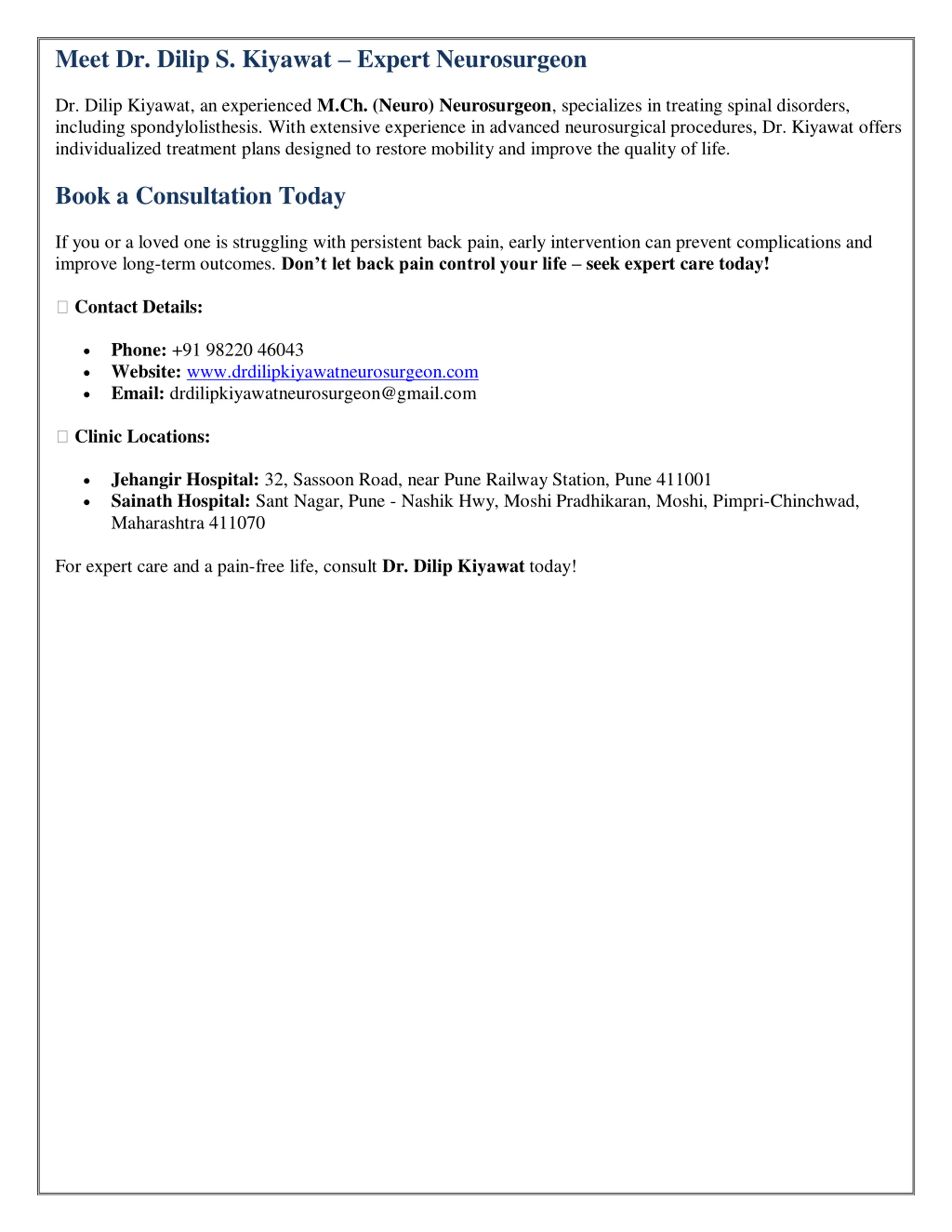 Meet Dr. Dilip S. Kiyawat Expert Neurosurgeon Dr. Dilip Kiyawat, an experienced M.Ch. (Neuro) Neurosurgeon, specializes in treating spinal disorders, including spondylolisthesis. With extensive experience in advanced neurosurgical procedures, Dr. Kiyawat offers individualized treatment plans designed to restore mobility and improve the quality of life. Book a Consultation Today If you or a loved one is struggling with persistent back pain, early intervention can prevent complications and improve long-term outcomes. Don t let back pain control your life seek expert care today! ?Contact Details: Phone: +91 98220 46043 Website: www.drdilipkiyawatneurosurgeon.com Email: drdilipkiyawatneurosurgeon@gmail.com ?Clinic Locations: Jehangir Hospital: 32, Sassoon Road, near Pune Railway Station, Pune 411001 Sainath Hospital: Sant Nagar, Pune - Nashik Hwy, Moshi Pradhikaran, Moshi, Pimpri-Chinchwad, Maharashtra 411070 For expert care and a pain-free life, consult Dr. Dilip Kiyawat today!