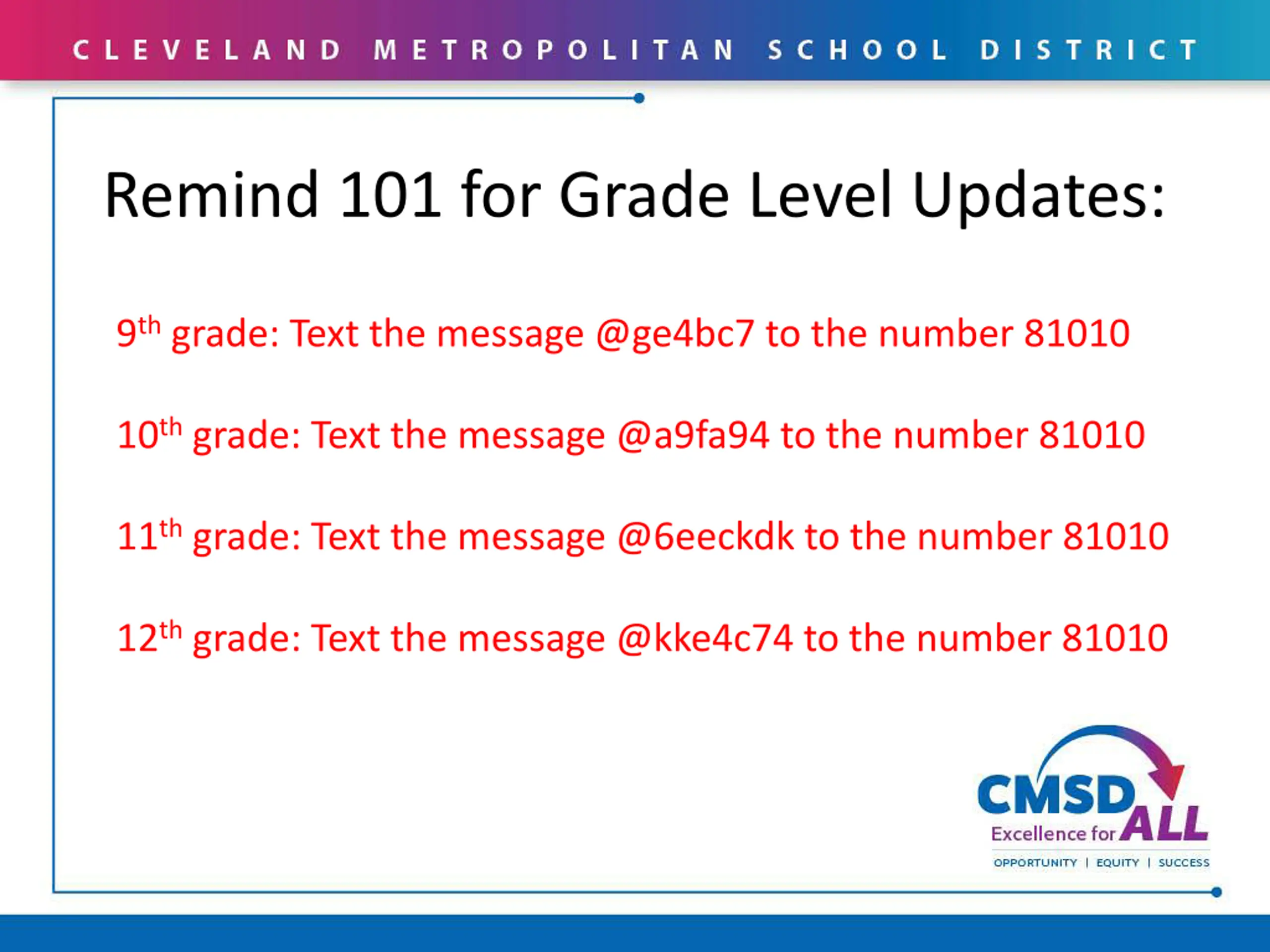 Remind 101 for Grade Level Updates: 9th grade: Text the message @ge4bc7 to the number 81010 10th grade: Text the message @a9fa94 to the number 81010 11th grade: Text the message @6eeckdk to the number 81010 12th grade: Text the message @kke4c74 to the number 81010