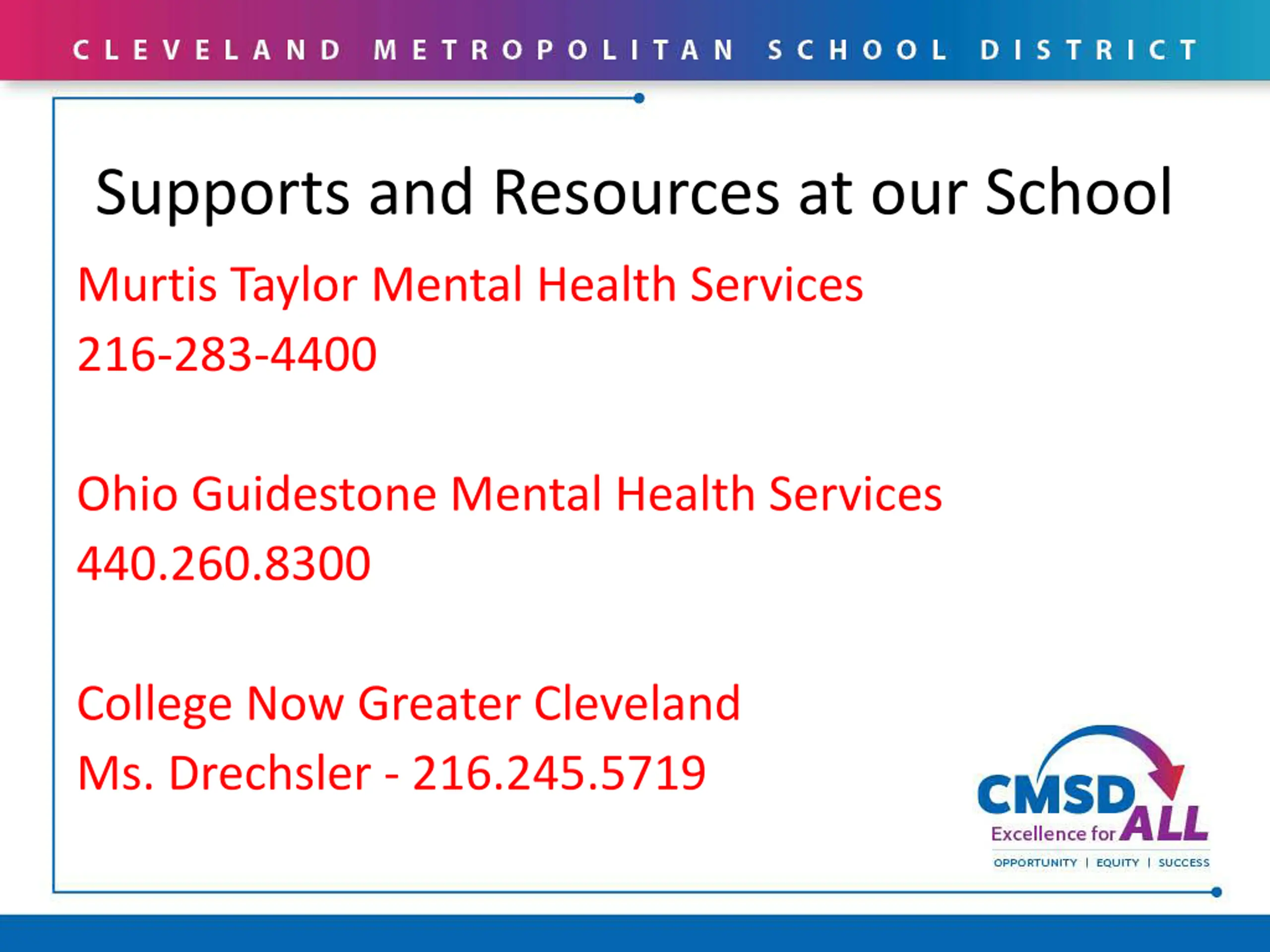 Supports and Resources at our School Murtis Taylor Mental Health Services 216-283-4400 Ohio Guidestone Mental Health Services 440.260.8300 College Now Greater Cleveland Ms. Drechsler - 216.245.5719