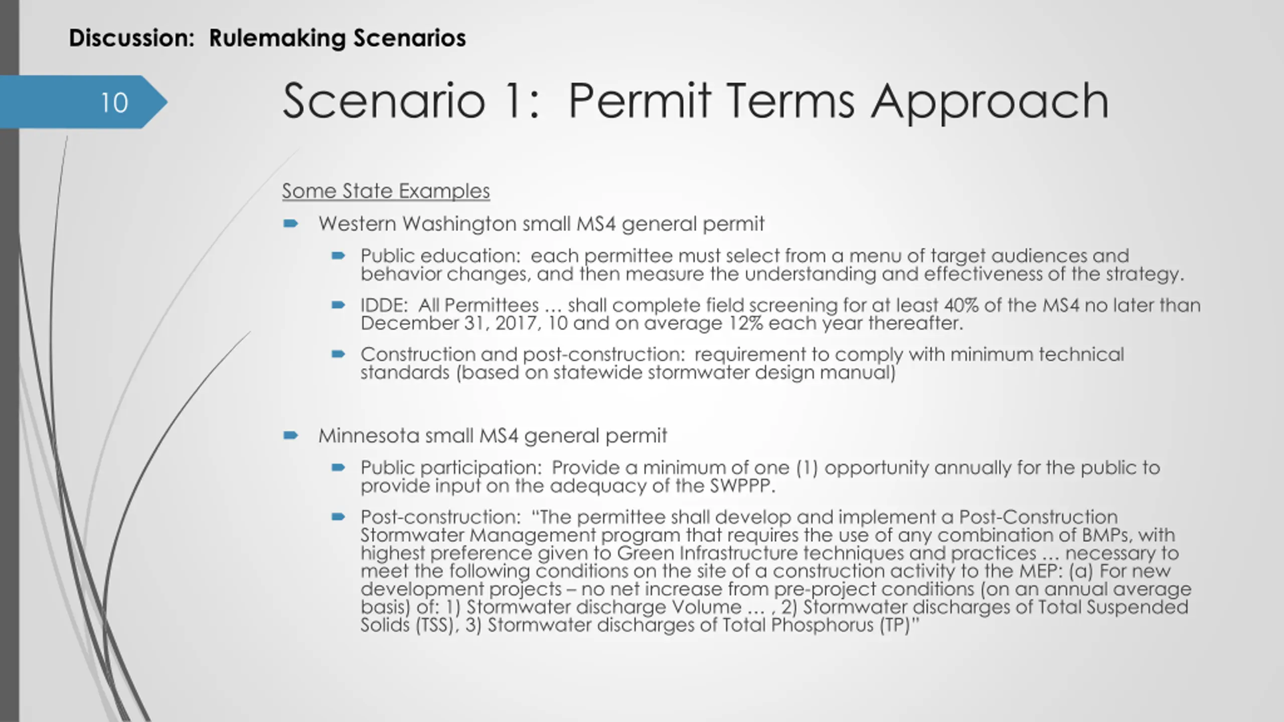 Discussion: Rulemaking Scenarios Scenario 1: Permit Terms Approach 10 Some State Examples Western Washington small MS4 general permit Public education: each permittee must select from a menu of target audiences and behavior changes, and then measure the understanding and effectiveness of the strategy. IDDE: All Permittees shall complete field screening for at least 40% of the MS4 no later than December 31, 2017, 10 and on average 12% each year thereafter. Construction and post-construction: requirement to comply with minimum technical standards (based on statewide stormwater design manual) Minnesota small MS4 general permit Public participation: Provide a minimum of one (1) opportunity annually for the public to provide input on the adequacy of the SWPPP. Post-construction: The permittee shall develop and implement a Post-Construction Stormwater Management program that requires the use of any combination of BMPs, with highest preference given to Green Infrastructure techniques and practices necessary to meet the following conditions on the site of a construction activity to the MEP: (a) For new development projects no net increase from pre-project conditions (on an annual average basis) of: 1) Stormwater discharge Volume , 2) Stormwater discharges of Total Suspended Solids (TSS), 3) Stormwater discharges of Total Phosphorus (TP)