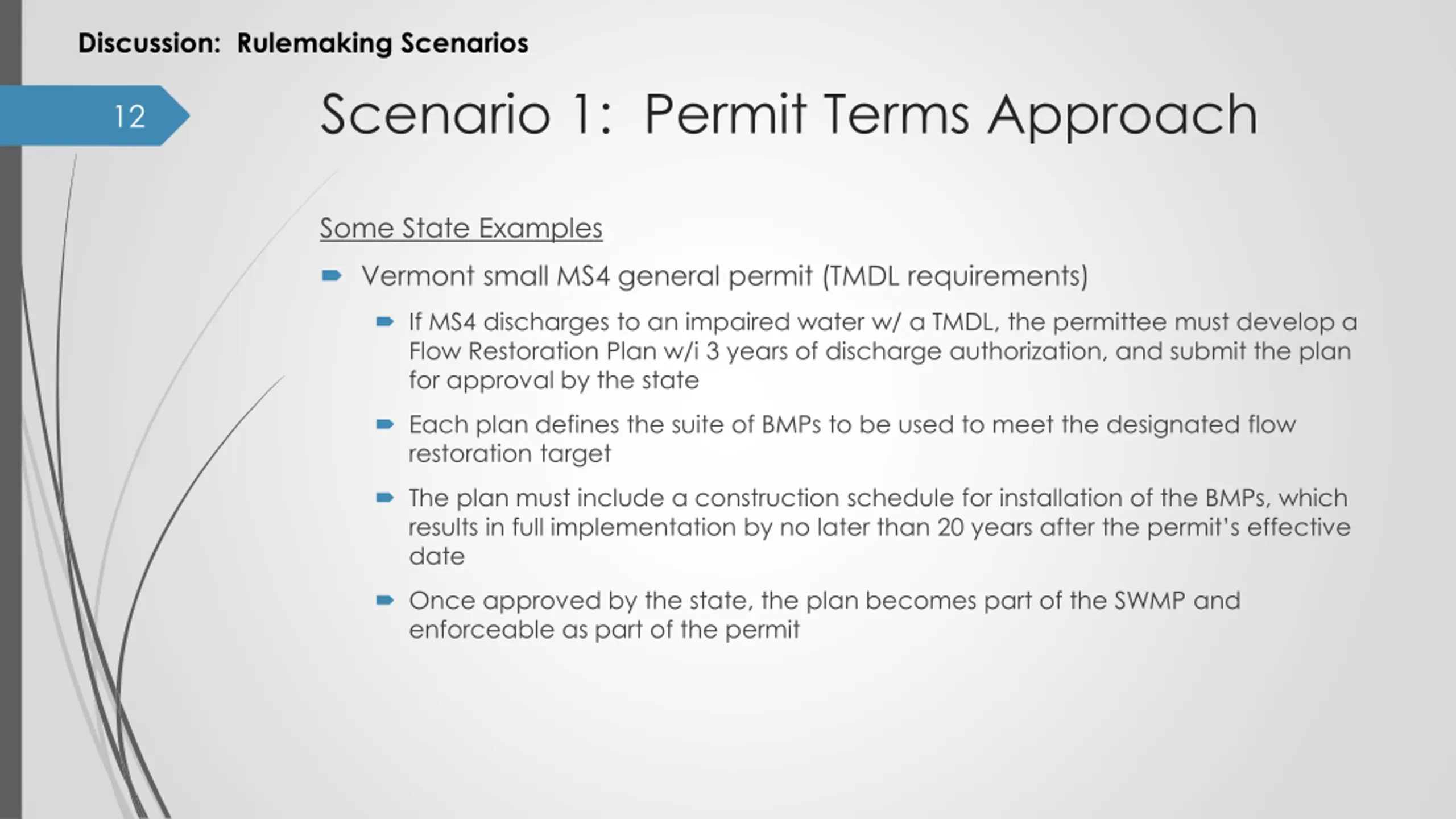 Discussion: Rulemaking Scenarios Scenario 1: Permit Terms Approach 12 Some State Examples Vermont small MS4 general permit (TMDL requirements) If MS4 discharges to an impaired water w/ a TMDL, the permittee must develop a Flow Restoration Plan w/i 3 years of discharge authorization, and submit the plan for approval by the state Each plan defines the suite of BMPs to be used to meet the designated flow restoration target The plan must include a construction schedule for installation of the BMPs, which results in full implementation by no later than 20 years after the permit s effective date Once approved by the state, the plan becomes part of the SWMP and enforceable as part of the permit