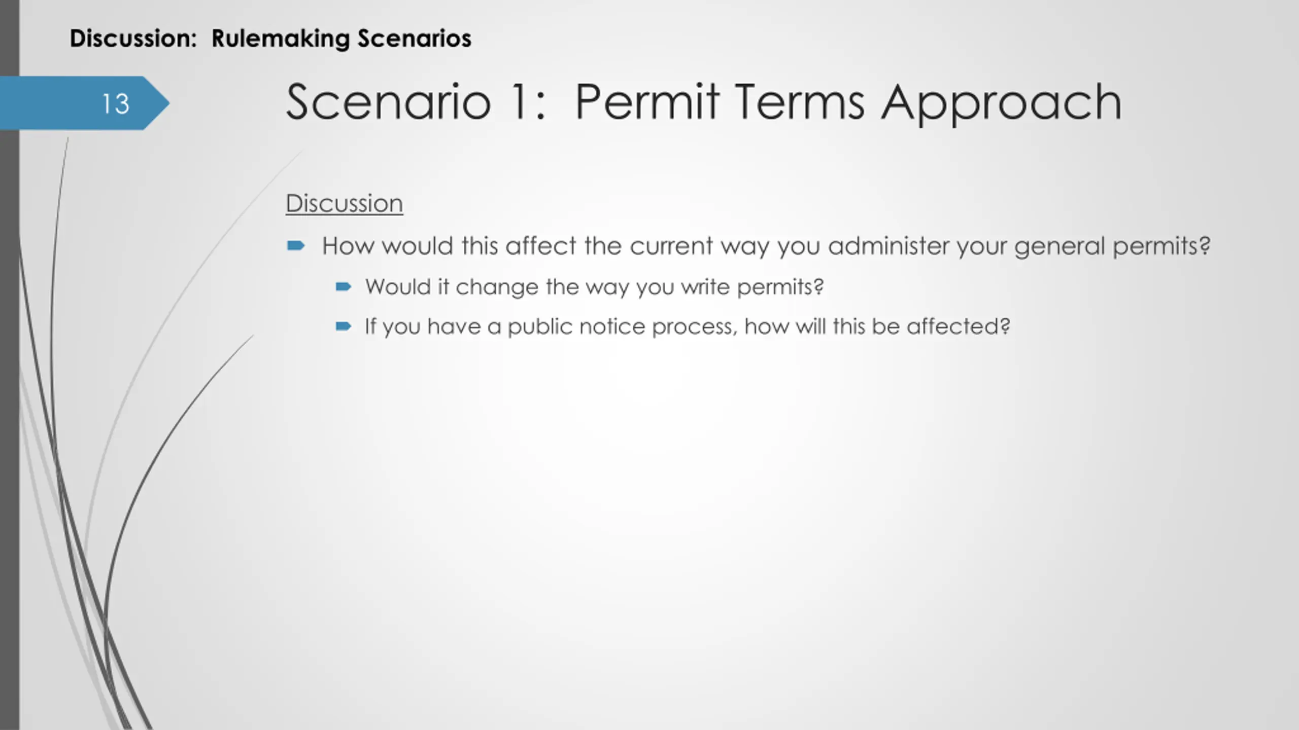 Discussion: Rulemaking Scenarios Scenario 1: Permit Terms Approach 13 Discussion How would this affect the current way you administer your general permits? Would it change the way you write permits? If you have a public notice process, how will this be affected?