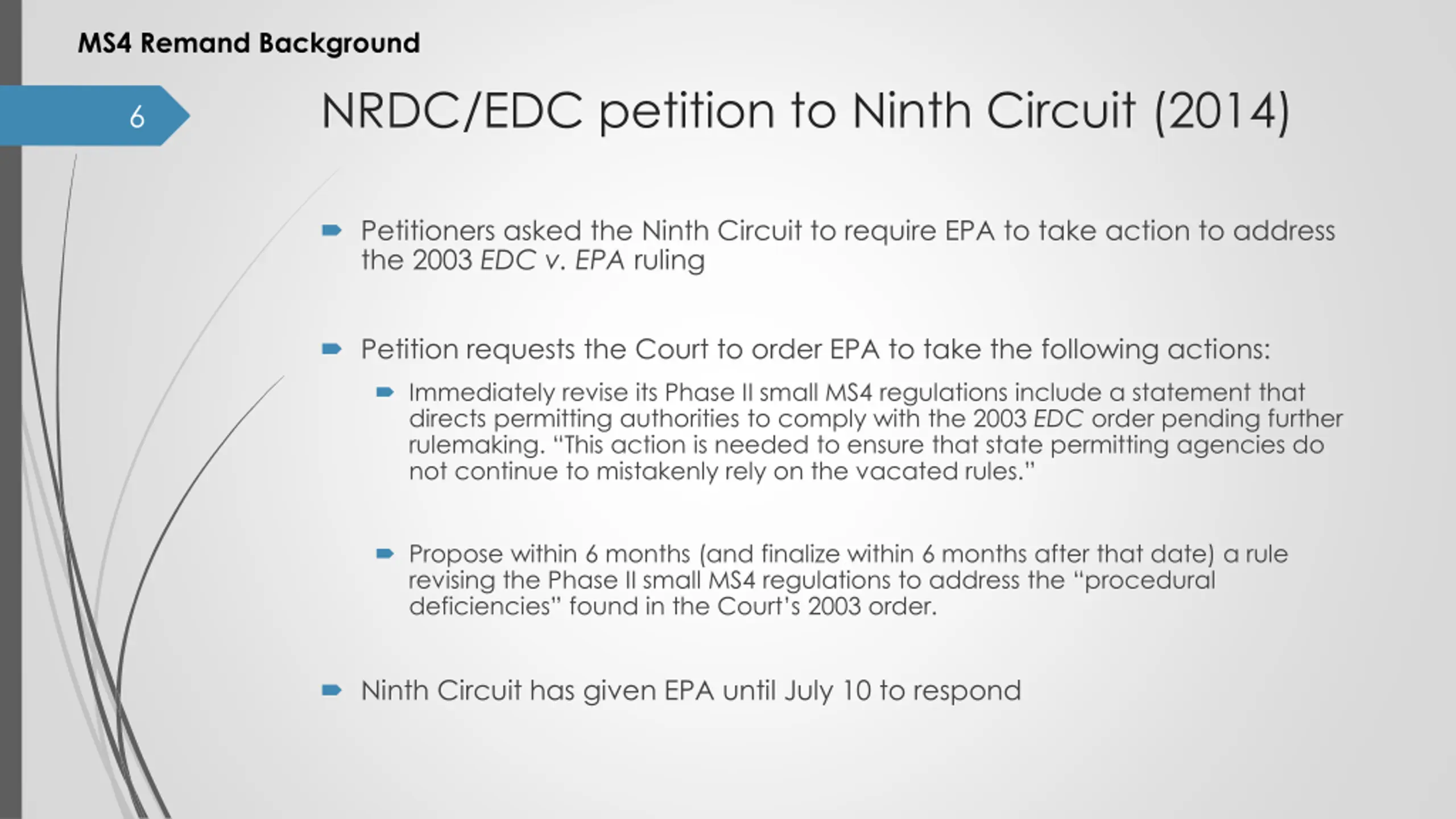 MS4 Remand Background NRDC/EDC petition to Ninth Circuit (2014) 6 Petitioners asked the Ninth Circuit to require EPA to take action to address the 2003 EDC v. EPA ruling Petition requests the Court to order EPA to take the following actions: Immediately revise its Phase II small MS4 regulations include a statement that directs permitting authorities to comply with the 2003 EDC order pending further rulemaking. This action is needed to ensure that state permitting agencies do not continue to mistakenly rely on the vacated rules. Propose within 6 months (and finalize within 6 months after that date) a rule revising the Phase II small MS4 regulations to address the procedural deficiencies found in the Court s 2003 order. Ninth Circuit has given EPA until July 10 to respond