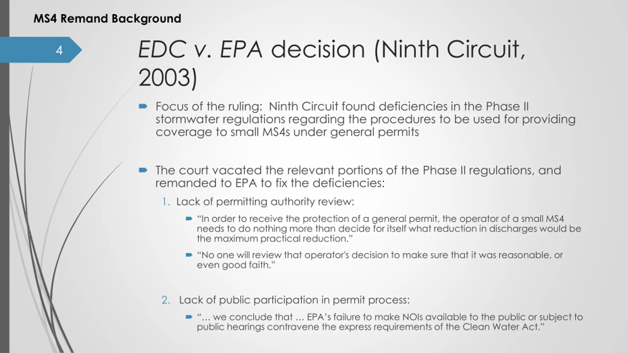 MS4 Remand Ruling provides insights into the deficiencies found in Phase II stormwater regulations by the Ninth Circuit in 2003. It highlights the lack of public participation, permitting authority review, and the need for improvements in the permitting process.