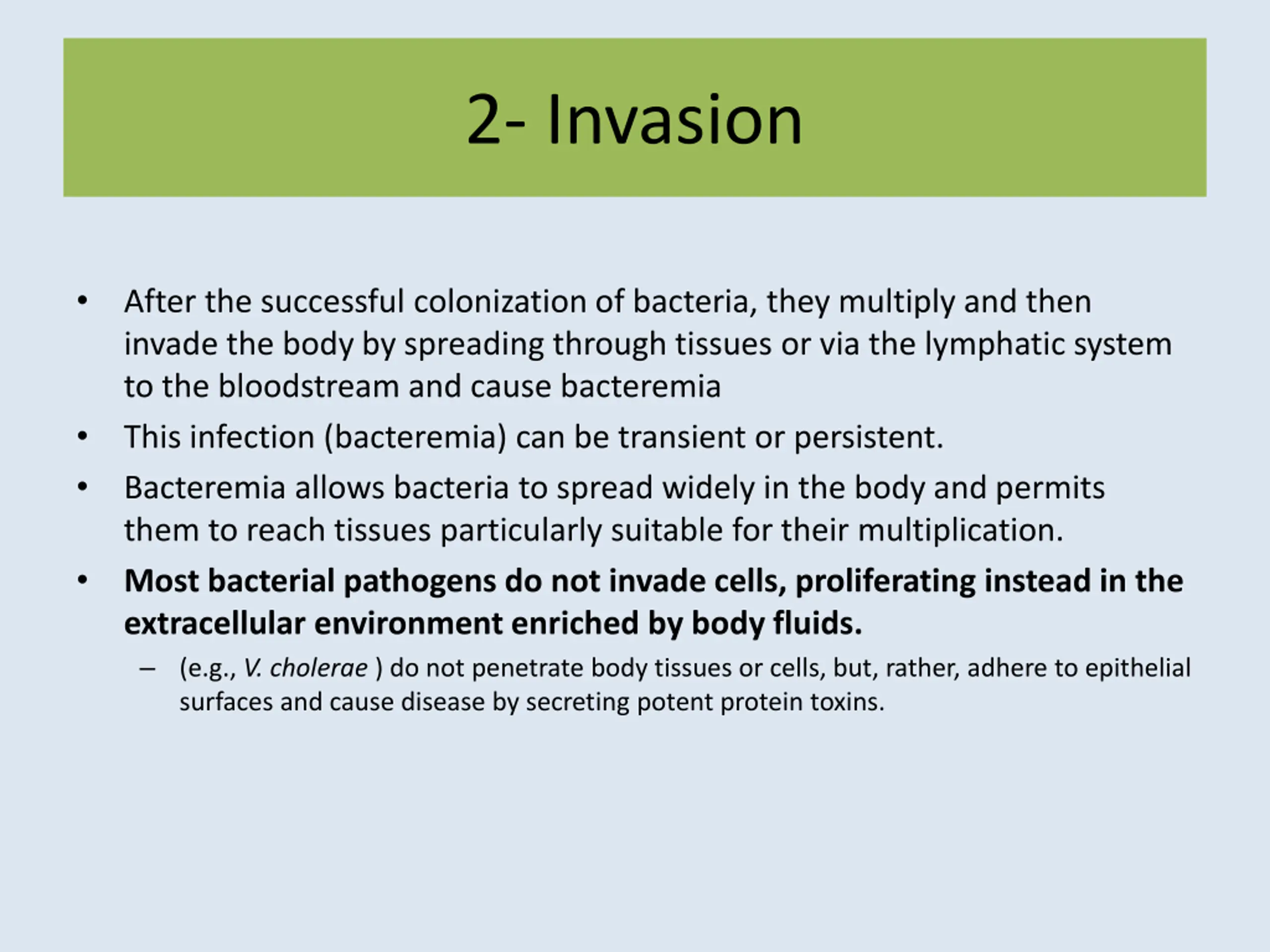 2- Invasion After the successful colonization of bacteria, they multiply and then invade the body by spreading through tissues or via the lymphatic system to the bloodstream and cause bacteremia This infection (bacteremia) can be transient or persistent. Bacteremia allows bacteria to spread widely in the body and permits them to reach tissues particularly suitable for their multiplication. Most bacterial pathogens do not invade cells, proliferating instead in the extracellular environment enriched by body fluids. (e.g., V. cholerae ) do not penetrate body tissues or cells, but, rather, adhere to epithelial surfaces and cause disease by secreting potent protein toxins.