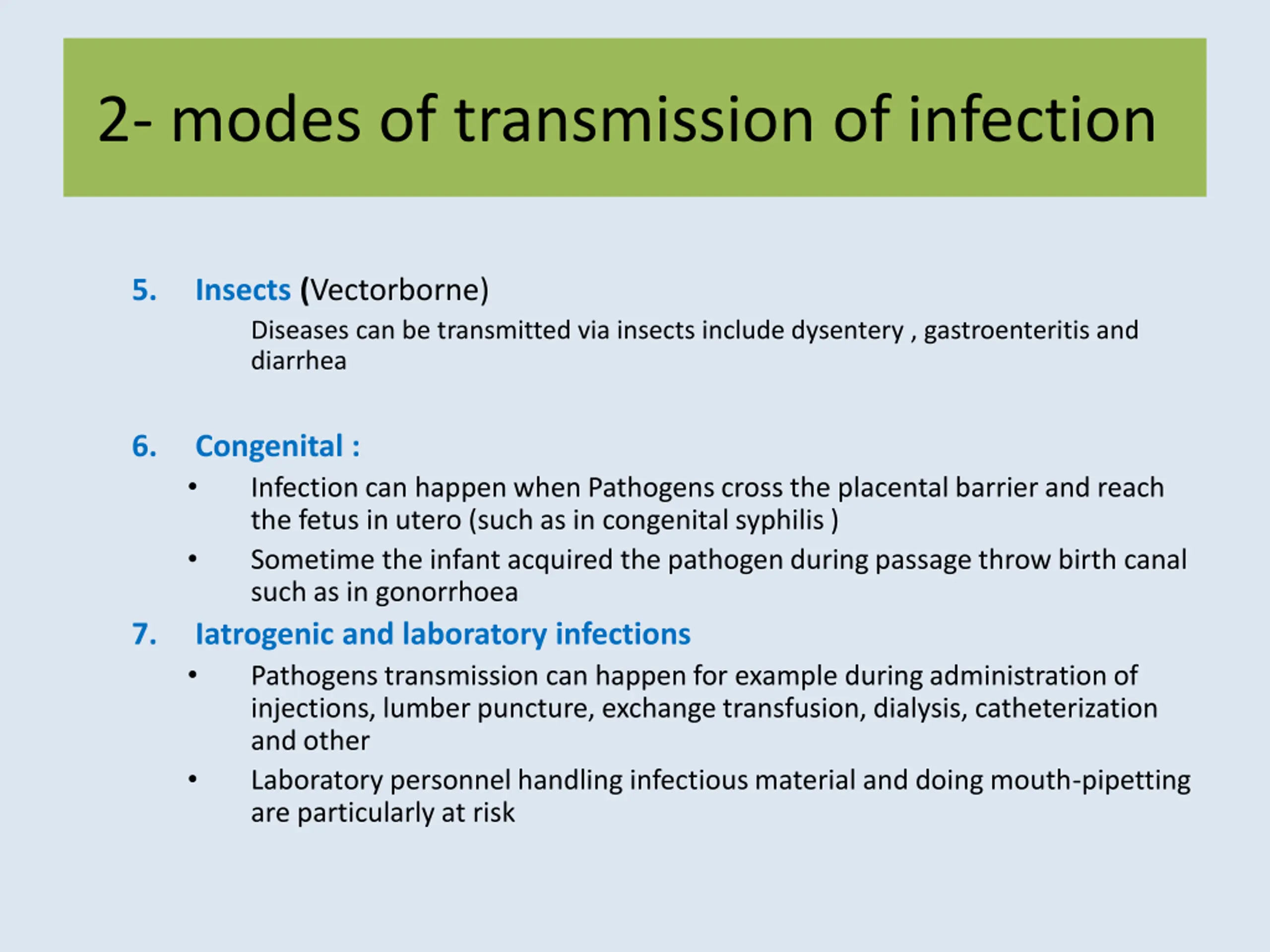 2- modes of transmission of infection 5. Insects (Vectorborne) Diseases can be transmitted via insects include dysentery , gastroenteritis and diarrhea 6. Congenital : Infection can happen when Pathogens cross the placental barrier and reach the fetus in utero (such as in congenital syphilis ) Sometime the infant acquired the pathogen during passage throw birth canal such as in gonorrhoea Iatrogenic and laboratory infections Pathogens transmission can happen for example during administration of injections, lumber puncture, exchange transfusion, dialysis, catheterization and other Laboratory personnel handling infectious material and doing mouth-pipetting are particularly at risk 7.