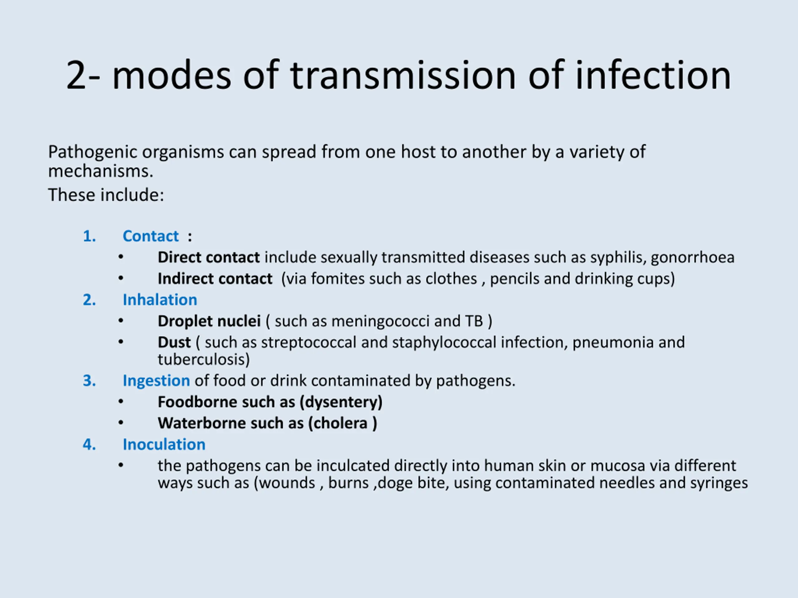 2- modes of transmission of infection Pathogenic organisms can spread from one host to another by a variety of mechanisms. These include: 1. Contact : Inhalation Droplet nuclei ( such as meningococci and TB ) Dust ( such as streptococcal and staphylococcal infection, pneumonia and tuberculosis) Ingestion of food or drink contaminated by pathogens. Foodborne such as (dysentery) Waterborne such as (cholera ) Inoculation the pathogens can be inculcated directly into human skin or mucosa via different ways such as (wounds , burns ,doge bite, using contaminated needles and syringes Direct contact include sexually transmitted diseases such as syphilis, gonorrhoea Indirect contact (via fomites such as clothes , pencils and drinking cups) 2. 3. 4.