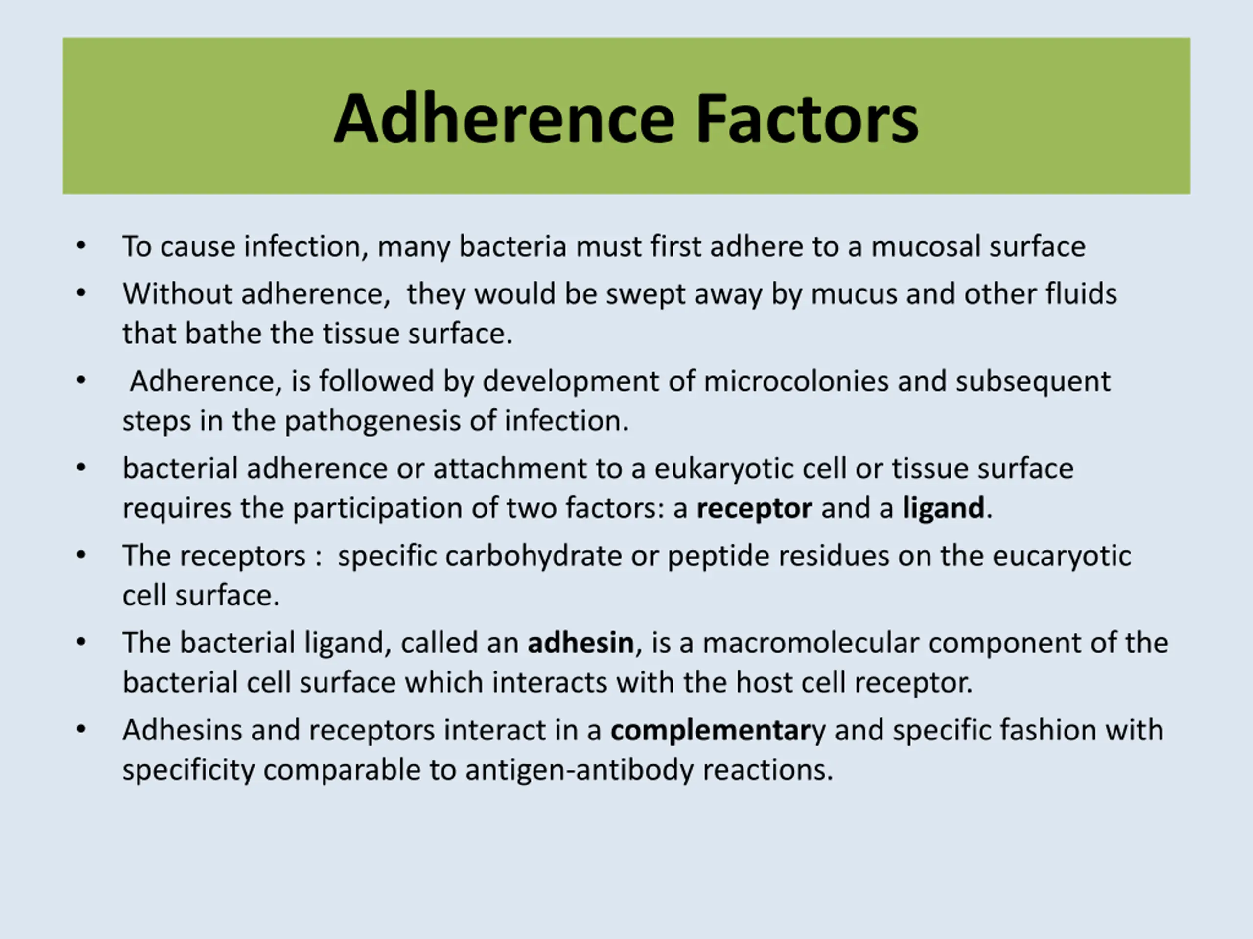 Adherence Factors To cause infection, many bacteria must first adhere to a mucosal surface Without adherence, they would be swept away by mucus and other fluids that bathe the tissue surface. Adherence, is followed by development of microcolonies and subsequent steps in the pathogenesis of infection. bacterial adherence or attachment to a eukaryotic cell or tissue surface requires the participation of two factors: a receptor and a ligand. The receptors : specific carbohydrate or peptide residues on the eucaryotic cell surface. The bacterial ligand, called an adhesin, is a macromolecular component of the bacterial cell surface which interacts with the host cell receptor. Adhesins and receptors interact in a complementary and specific fashion with specificity comparable to antigen-antibody reactions.