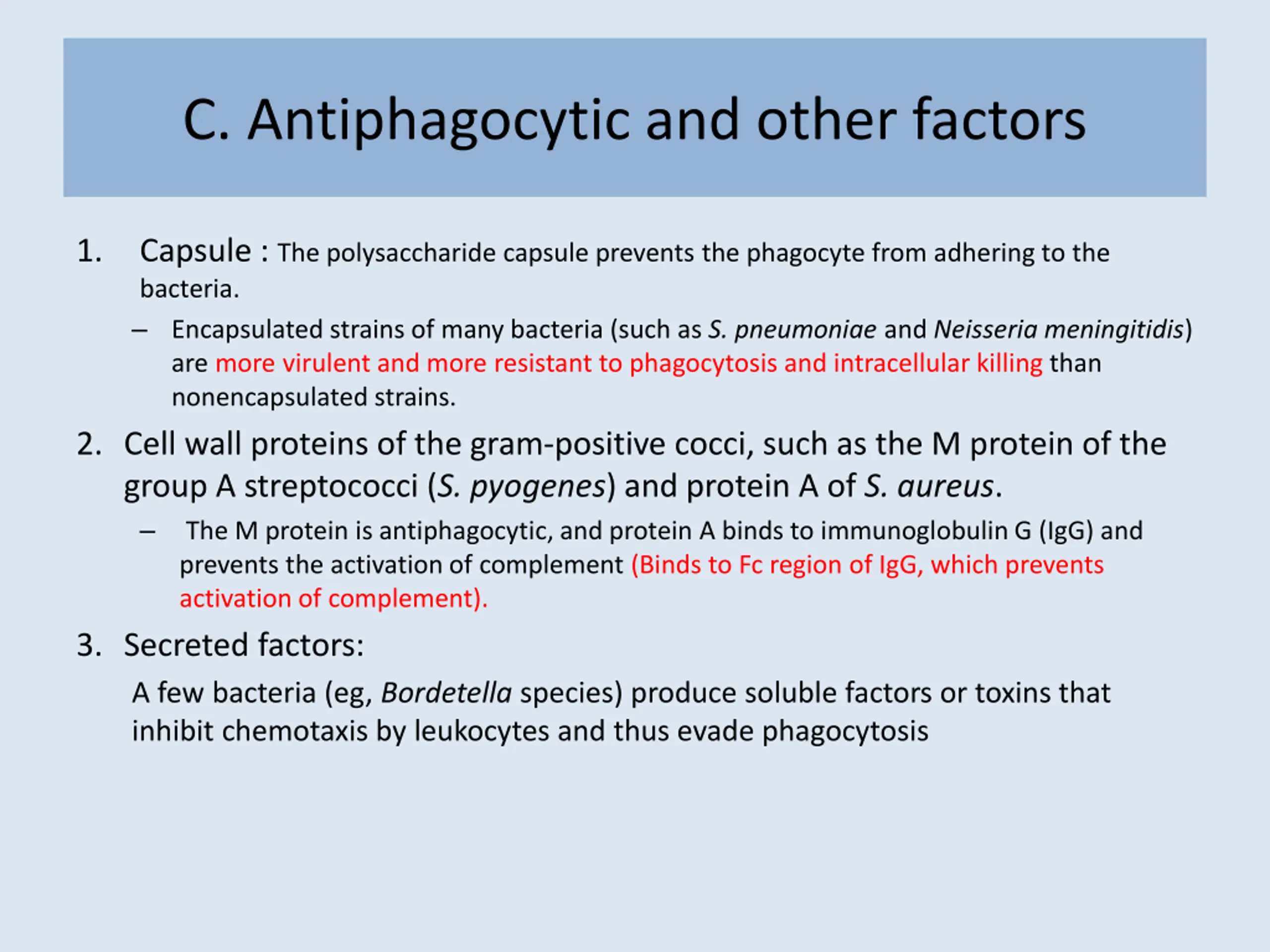 C. Antiphagocytic and other factors 1. Capsule : The polysaccharide capsule prevents the phagocyte from adhering to the bacteria. Encapsulated strains of many bacteria (such as S. pneumoniae and Neisseria meningitidis) are more virulent and more resistant to phagocytosis and intracellular killing than nonencapsulated strains. 2. Cell wall proteins of the gram-positive cocci, such as the M protein of the group A streptococci (S. pyogenes) and protein A of S. aureus. The M protein is antiphagocytic, and protein A binds to immunoglobulin G (IgG) and prevents the activation of complement (Binds to Fc region of IgG, which prevents activation of complement). 3. Secreted factors: A few bacteria (eg, Bordetella species) produce soluble factors or toxins that inhibit chemotaxis by leukocytes and thus evade phagocytosis