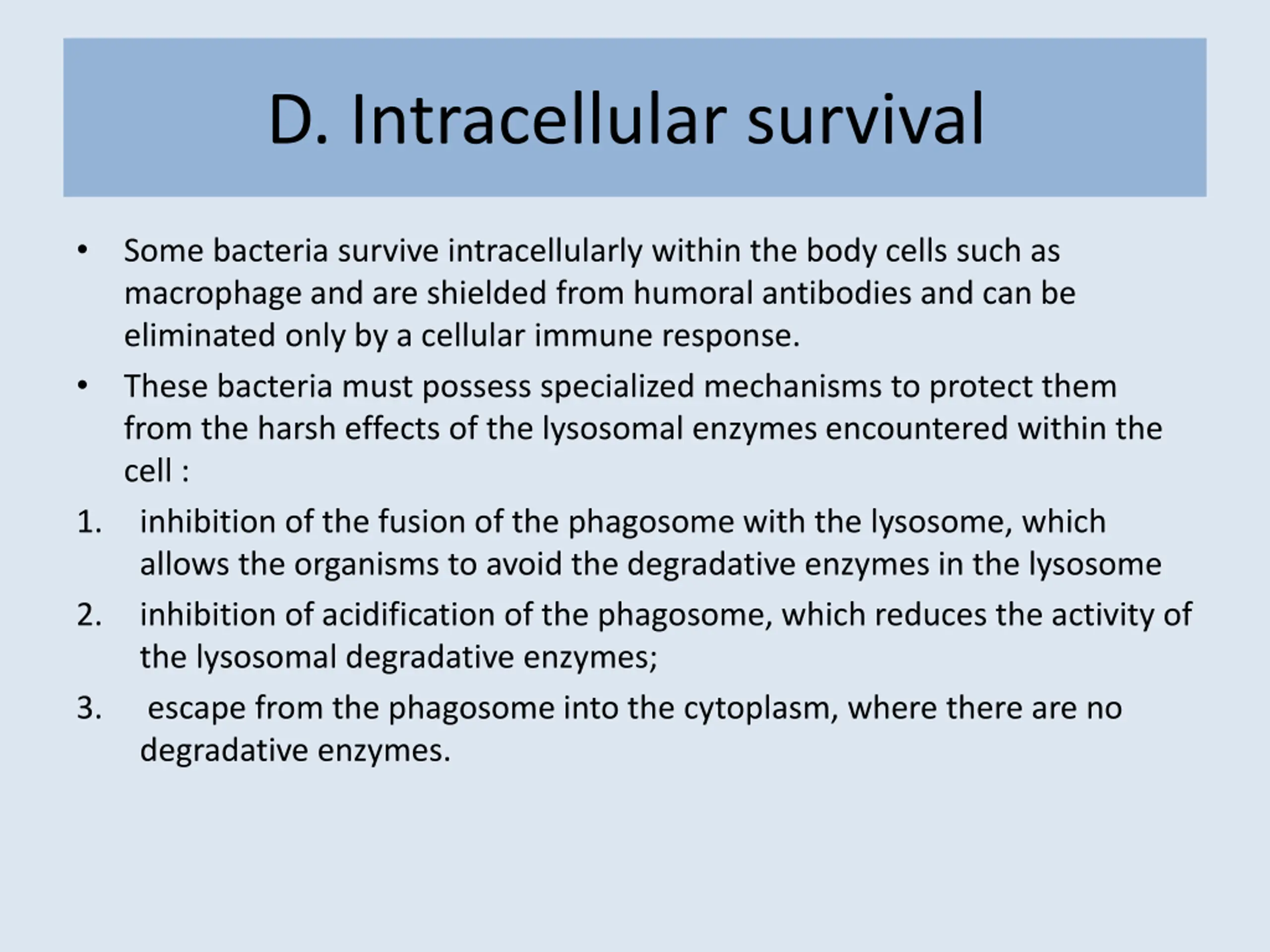 D. Intracellular survival Some bacteria survive intracellularly within the body cells such as macrophage and are shielded from humoral antibodies and can be eliminated only by a cellular immune response. These bacteria must possess specialized mechanisms to protect them from the harsh effects of the lysosomal enzymes encountered within the cell : inhibition of the fusion of the phagosome with the lysosome, which allows the organisms to avoid the degradative enzymes in the lysosome inhibition of acidification of the phagosome, which reduces the activity of the lysosomal degradative enzymes; escape from the phagosome into the cytoplasm, where there are no degradative enzymes. 1. 2. 3.