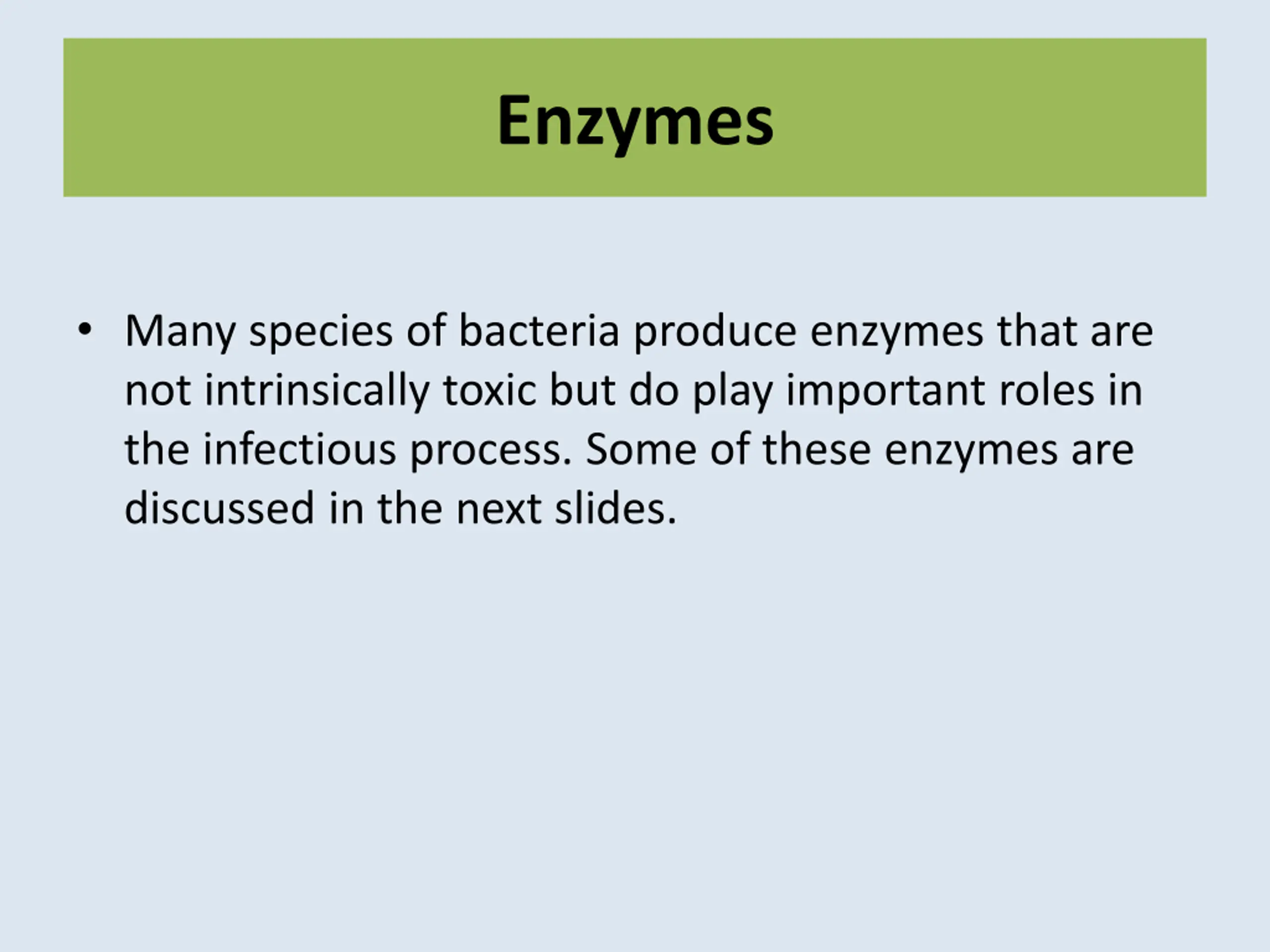 Enzymes Many species of bacteria produce enzymes that are not intrinsically toxic but do play important roles in the infectious process. Some of these enzymes are discussed in the next slides.