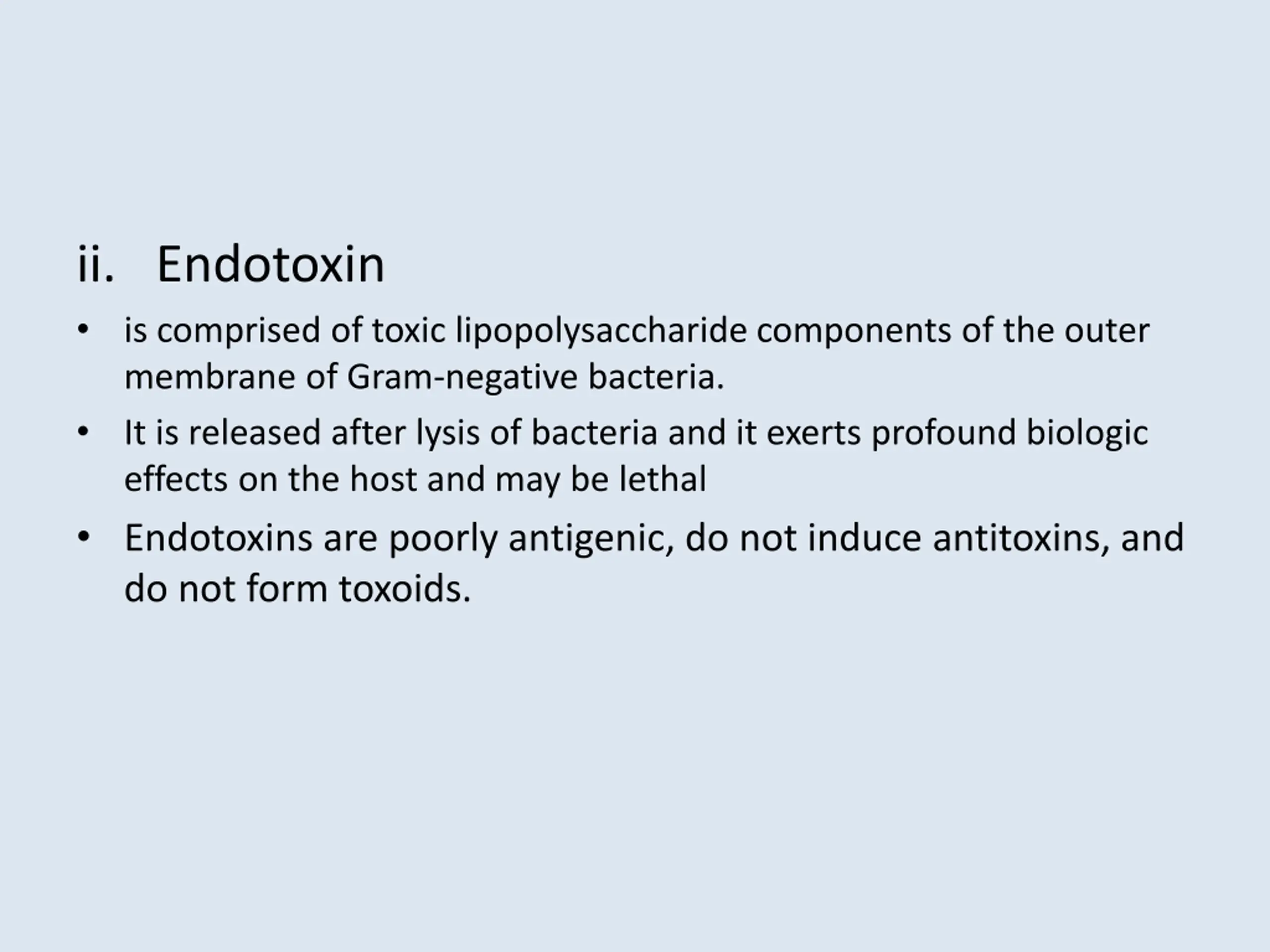 ii. Endotoxin is comprised of toxic lipopolysaccharide components of the outer membrane of Gram-negative bacteria. It is released after lysis of bacteria and it exerts profound biologic effects on the host and may be lethal Endotoxins are poorly antigenic, do not induce antitoxins, and do not form toxoids.