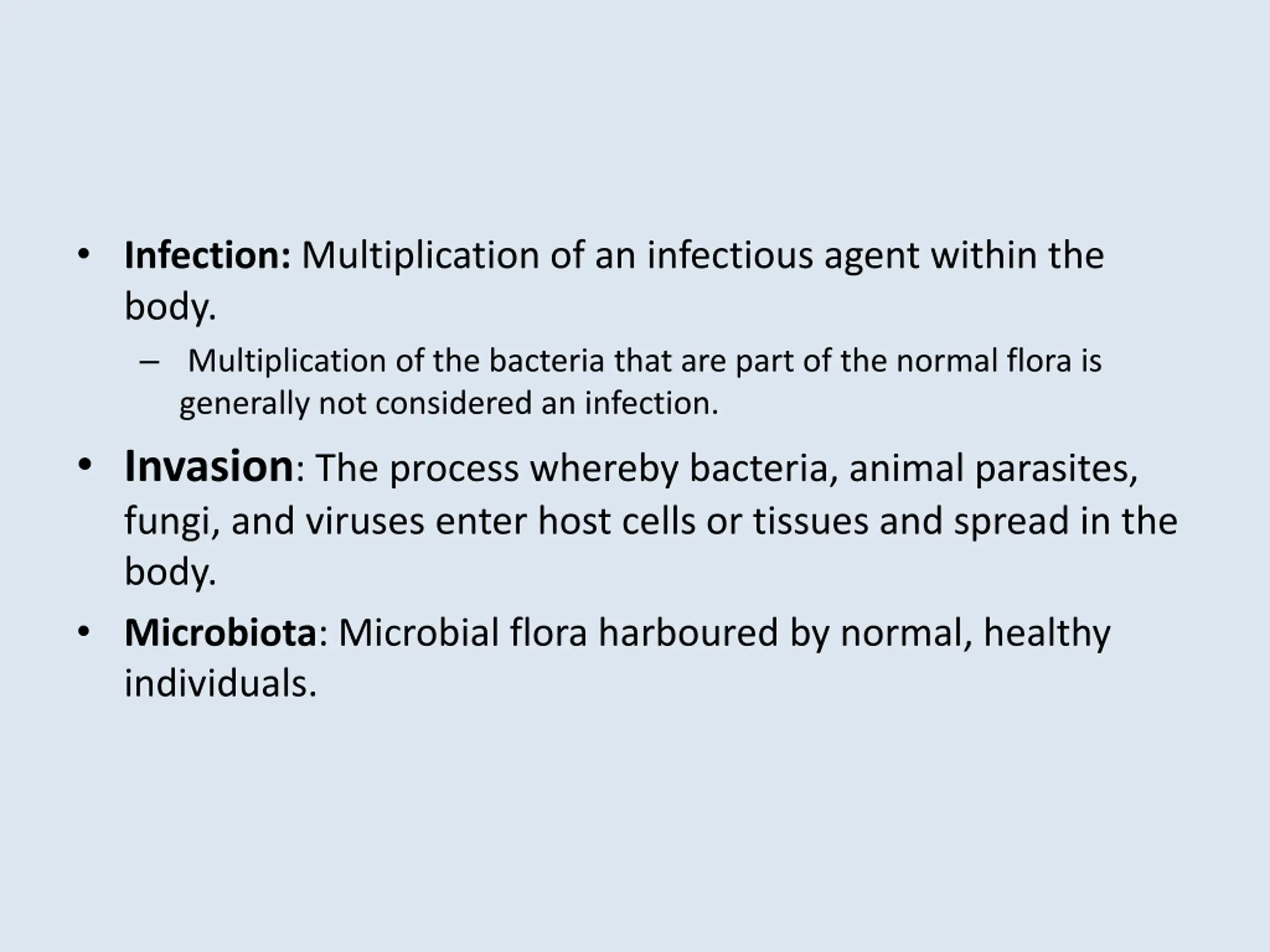 Infection: Multiplication of an infectious agent within the body. Multiplication of the bacteria that are part of the normal flora is generally not considered an infection. Invasion: The process whereby bacteria, animal parasites, fungi, and viruses enter host cells or tissues and spread in the body. Microbiota: Microbial flora harboured by normal, healthy individuals.