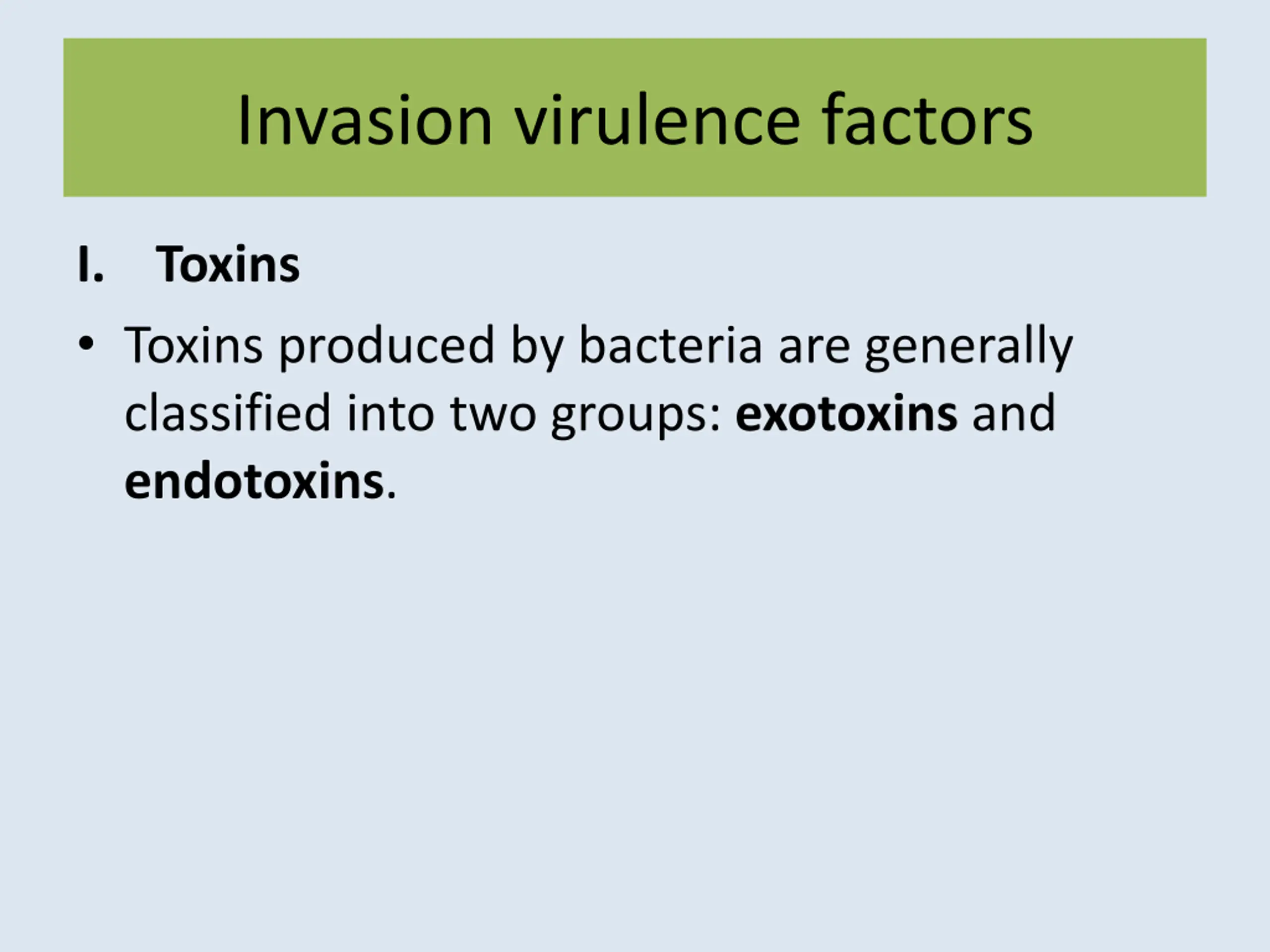 Invasion virulence factors I. Toxins Toxins produced by bacteria are generally classified into two groups: exotoxins and endotoxins.