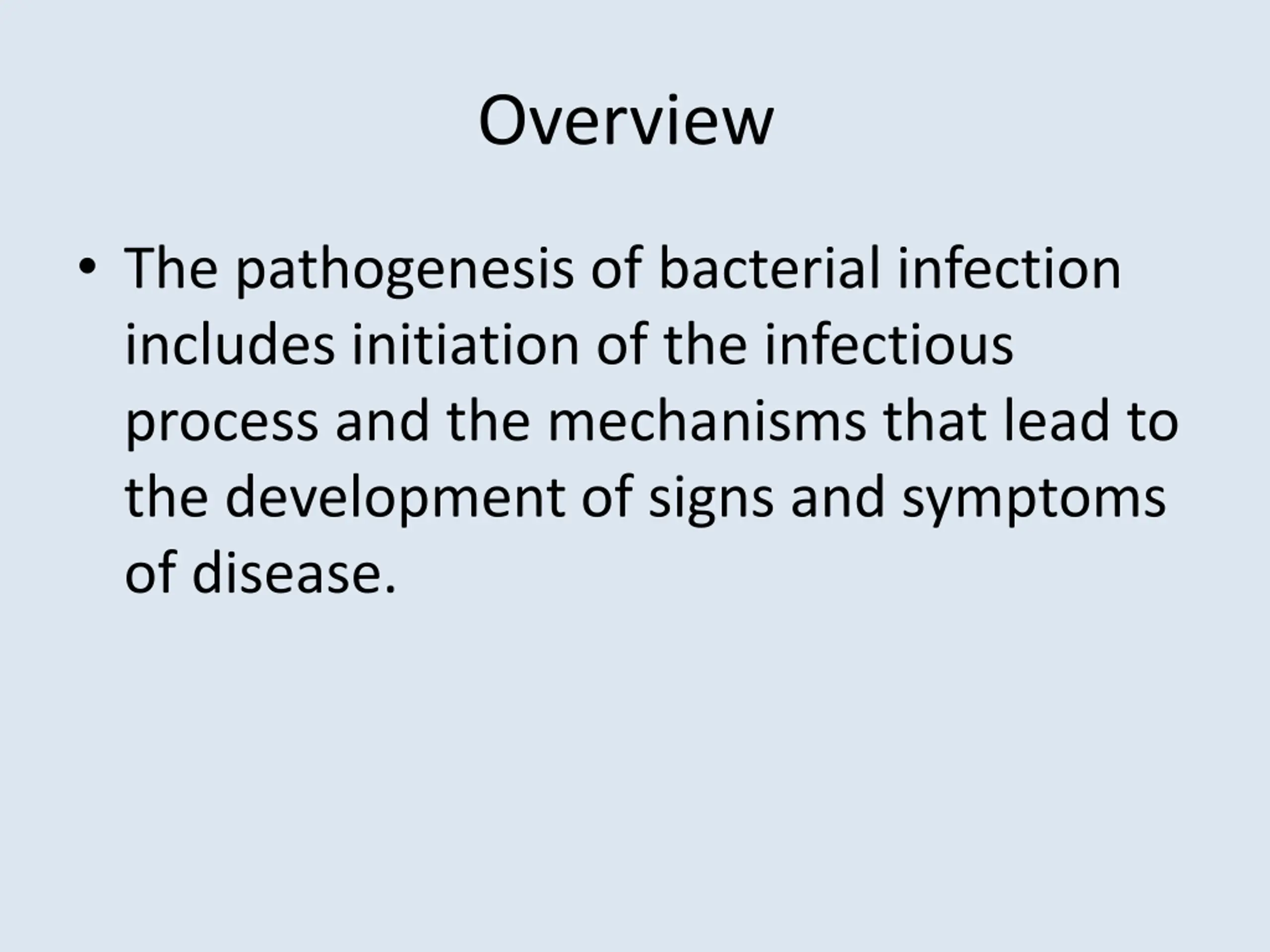 Overview The pathogenesis of bacterial infection includes initiation of the infectious process and the mechanisms that lead to the development of signs and symptoms of disease.