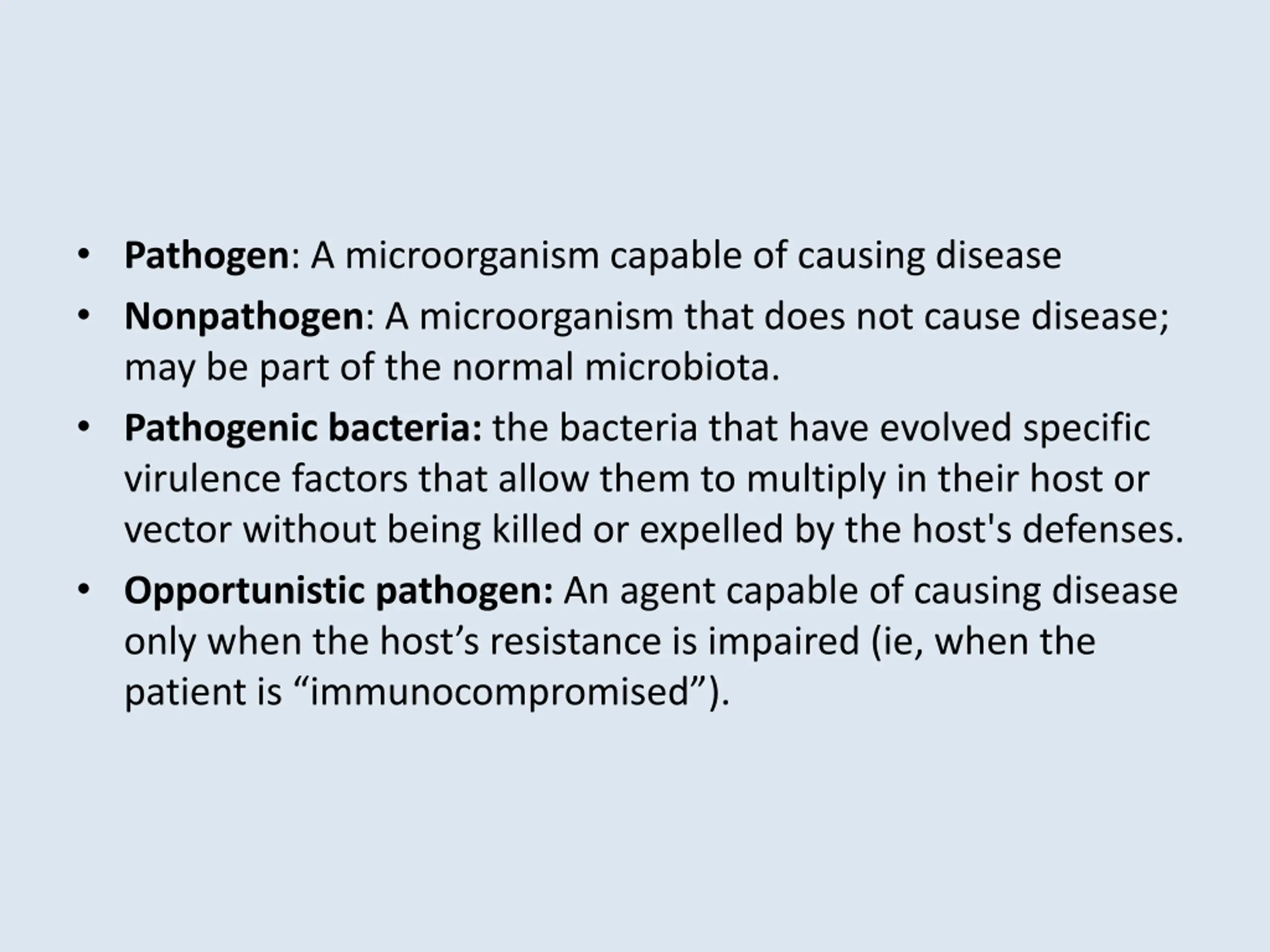 Pathogen: A microorganism capable of causing disease Nonpathogen: A microorganism that does not cause disease; may be part of the normal microbiota. Pathogenic bacteria: the bacteria that have evolved specific virulence factors that allow them to multiply in their host or vector without being killed or expelled by the host's defenses. Opportunistic pathogen: An agent capable of causing disease only when the host s resistance is impaired (ie, when the patient is immunocompromised ).