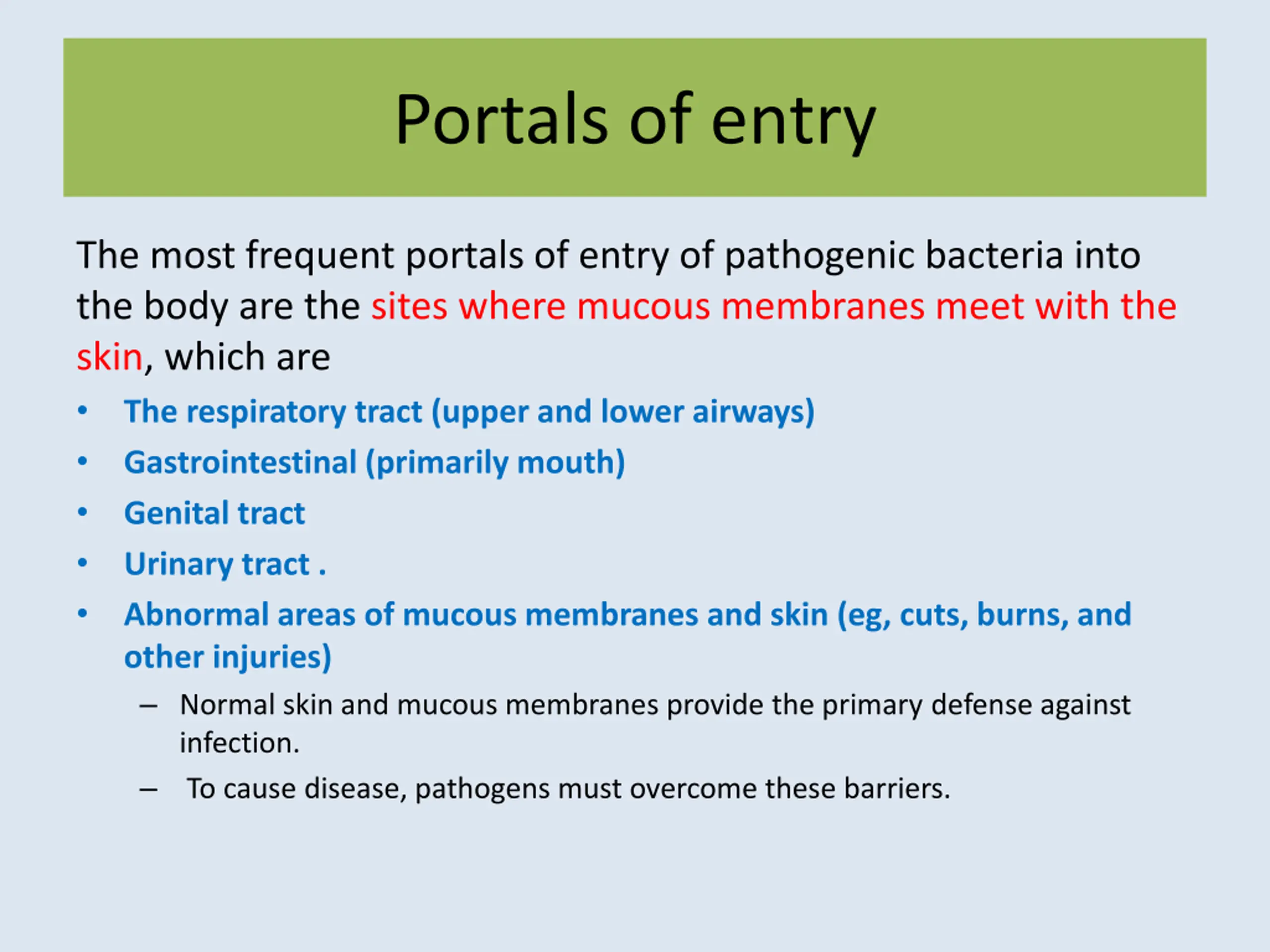Portals of entry The most frequent portals of entry of pathogenic bacteria into the body are the sites where mucous membranes meet with the skin, which are The respiratory tract (upper and lower airways) Gastrointestinal (primarily mouth) Genital tract Urinary tract . Abnormal areas of mucous membranes and skin (eg, cuts, burns, and other injuries) Normal skin and mucous membranes provide the primary defense against infection. To cause disease, pathogens must overcome these barriers.