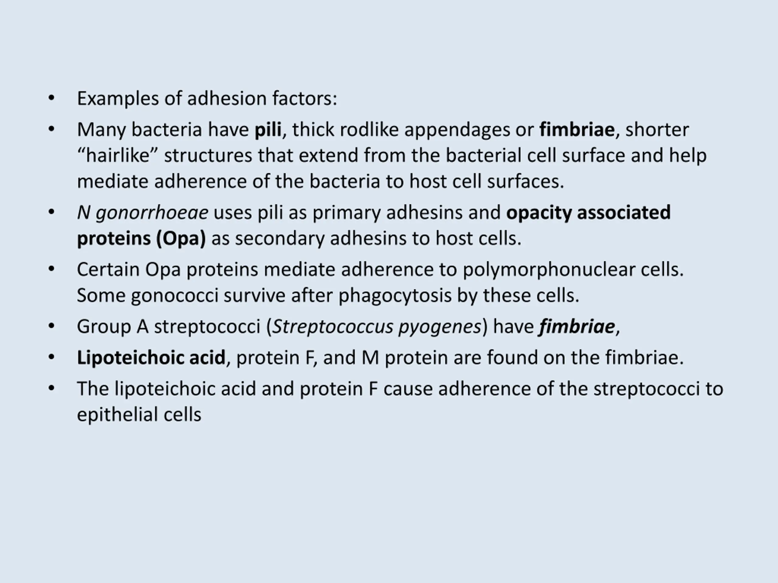 Examples of adhesion factors: Many bacteria have pili, thick rodlike appendages or fimbriae, shorter hairlike structures that extend from the bacterial cell surface and help mediate adherence of the bacteria to host cell surfaces. N gonorrhoeae uses pili as primary adhesins and opacity associated proteins (Opa) as secondary adhesins to host cells. Certain Opa proteins mediate adherence to polymorphonuclear cells. Some gonococci survive after phagocytosis by these cells. Group A streptococci (Streptococcus pyogenes) have fimbriae, Lipoteichoic acid, protein F, and M protein are found on the fimbriae. The lipoteichoic acid and protein F cause adherence of the streptococci to epithelial cells