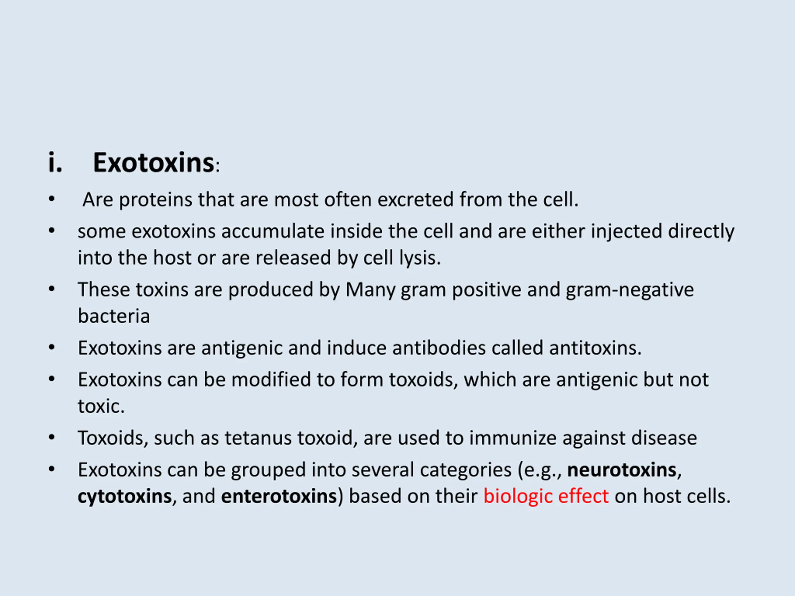 i. Exotoxins: Are proteins that are most often excreted from the cell. some exotoxins accumulate inside the cell and are either injected directly into the host or are released by cell lysis. These toxins are produced by Many gram positive and gram-negative bacteria Exotoxins are antigenic and induce antibodies called antitoxins. Exotoxins can be modified to form toxoids, which are antigenic but not toxic. Toxoids, such as tetanus toxoid, are used to immunize against disease Exotoxins can be grouped into several categories (e.g., neurotoxins, cytotoxins, and enterotoxins) based on their biologic effect on host cells.