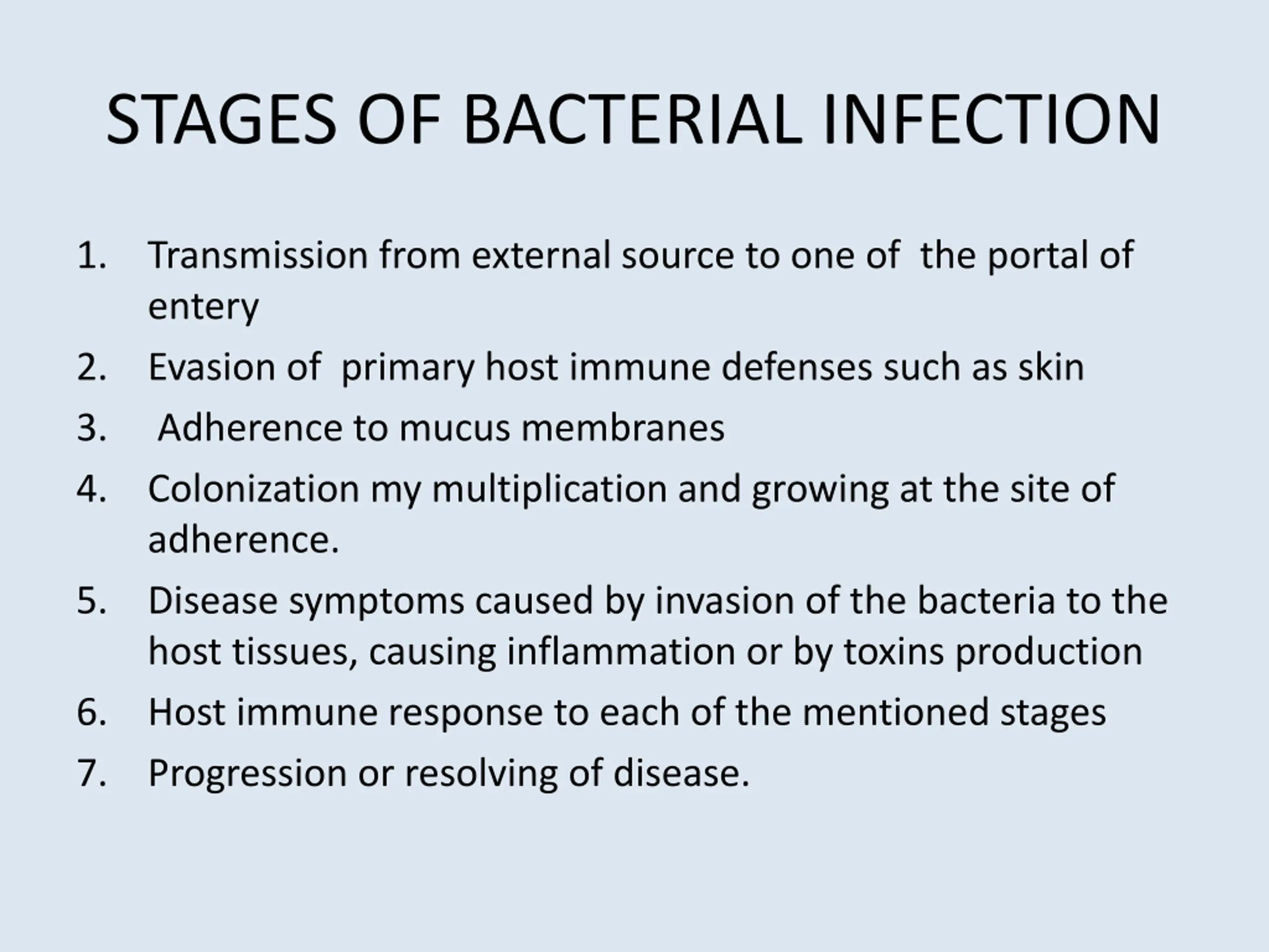 STAGES OF BACTERIAL INFECTION 1. Transmission from external source to one of the portal of entery Evasion of primary host immune defenses such as skin Adherence to mucus membranes Colonization my multiplication and growing at the site of adherence. Disease symptoms caused by invasion of the bacteria to the host tissues, causing inflammation or by toxins production Host immune response to each of the mentioned stages Progression or resolving of disease. 2. 3. 4. 5. 6. 7.
