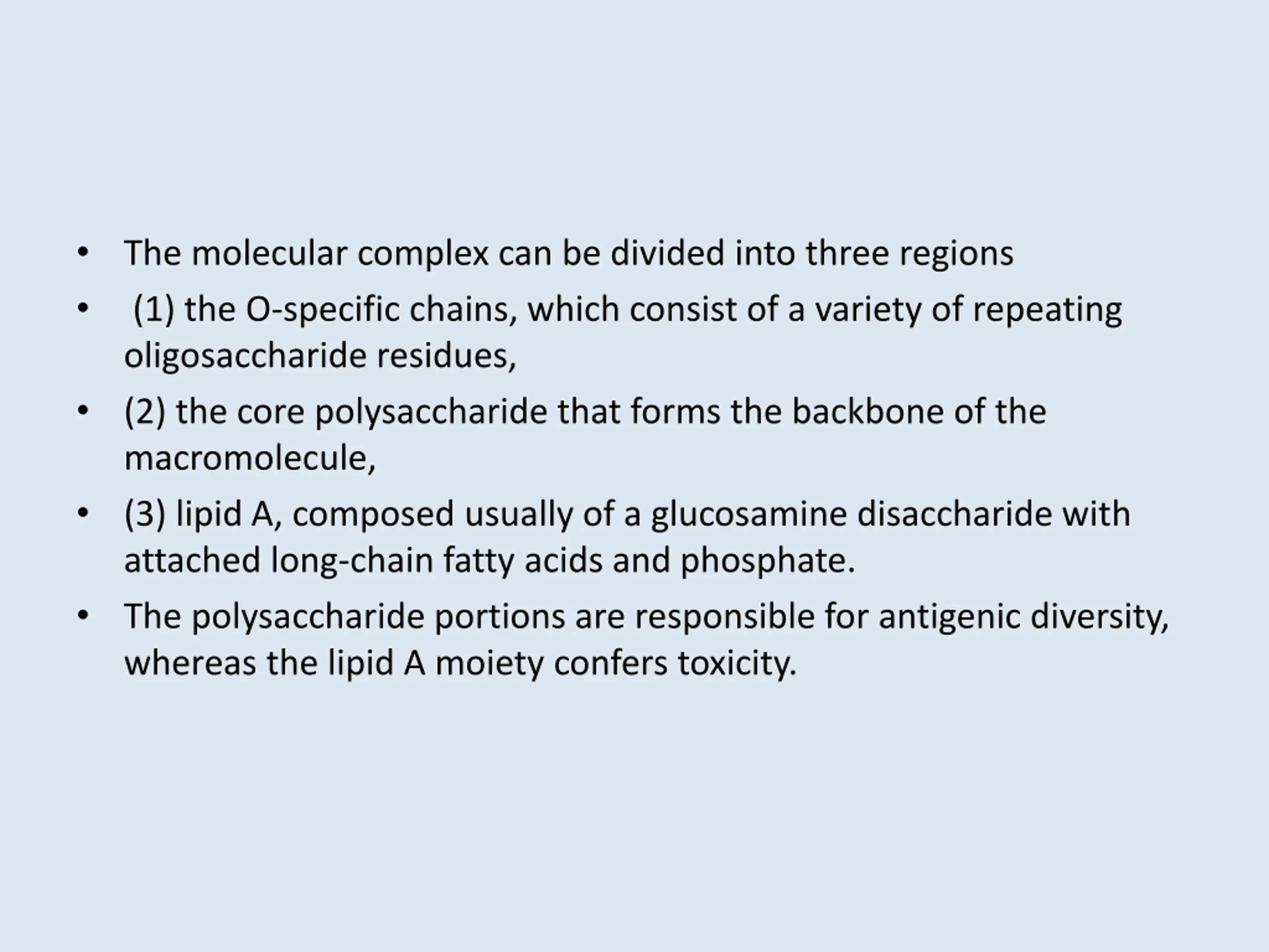 The molecular complex can be divided into three regions (1) the O-specific chains, which consist of a variety of repeating oligosaccharide residues, (2) the core polysaccharide that forms the backbone of the macromolecule, (3) lipid A, composed usually of a glucosamine disaccharide with attached long-chain fatty acids and phosphate. The polysaccharide portions are responsible for antigenic diversity, whereas the lipid A moiety confers toxicity.