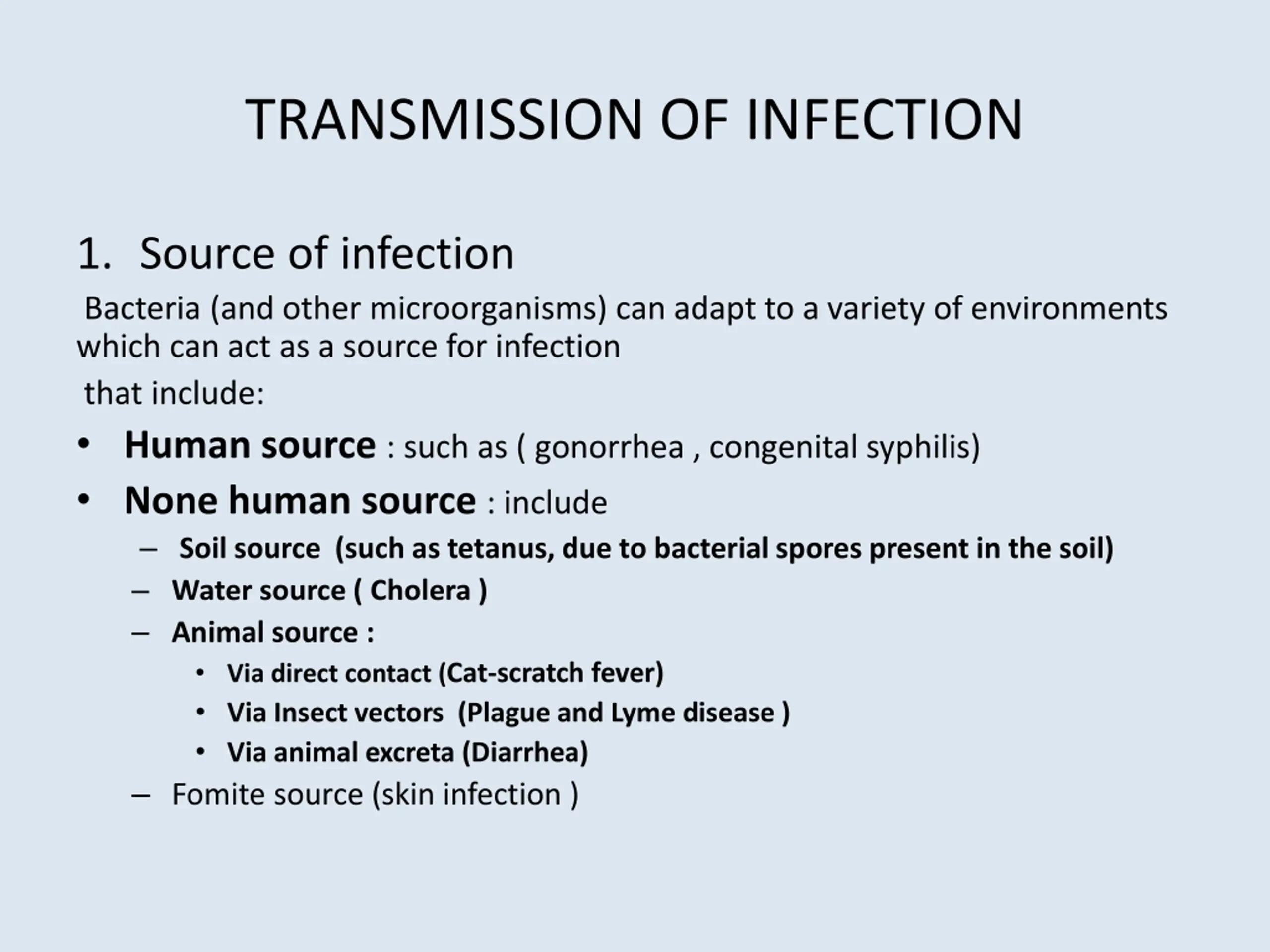 TRANSMISSION OF INFECTION 1. Source of infection Bacteria (and other microorganisms) can adapt to a variety of environments which can act as a source for infection that include: Human source : such as ( gonorrhea , congenital syphilis) None human source : include Soil source (such as tetanus, due to bacterial spores present in the soil) Water source ( Cholera ) Animal source : Via direct contact (Cat-scratch fever) Via Insect vectors (Plague and Lyme disease ) Via animal excreta (Diarrhea) Fomite source (skin infection )