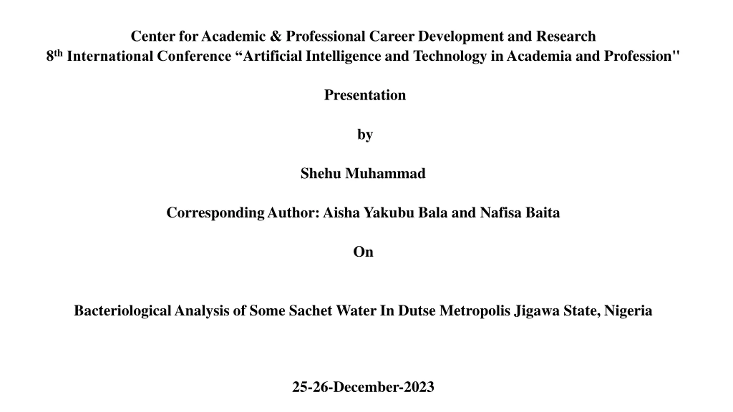 Center for Academic & Professional Career Development and Research 8thInternational Conference Artificial Intelligence and Technology in Academia and Profession" Presentation by Shehu Muhammad Corresponding Author: Aisha Yakubu Bala and Nafisa Baita On Bacteriological Analysis of Some Sachet Water In Dutse Metropolis Jigawa State, Nigeria 25-26-December-2023