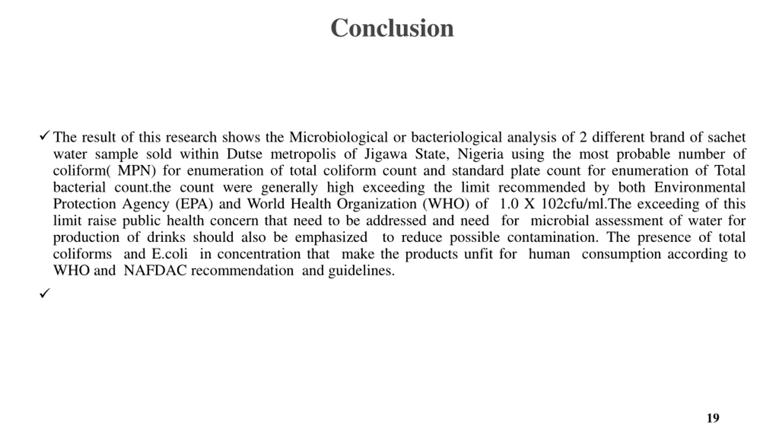 Conclusion The result of this research shows the Microbiological or bacteriological analysis of 2 different brand of sachet water sample sold within Dutse metropolis of Jigawa State, Nigeria using the most probable number of coliform( MPN) for enumeration of total coliform count and standard plate count for enumeration of Total bacterial count.the count were generally high exceeding the limit recommended by both Environmental Protection Agency (EPA) and World Health Organization (WHO) of 1.0 X 102cfu/ml.The exceeding of this limit raise public health concern that need to be addressed and need for microbial assessment of water for production of drinks should also be emphasized to reduce possible contamination. The presence of total coliforms and E.coli in concentration that make the products unfit for human consumption according to WHO and NAFDAC recommendation and guidelines. 19