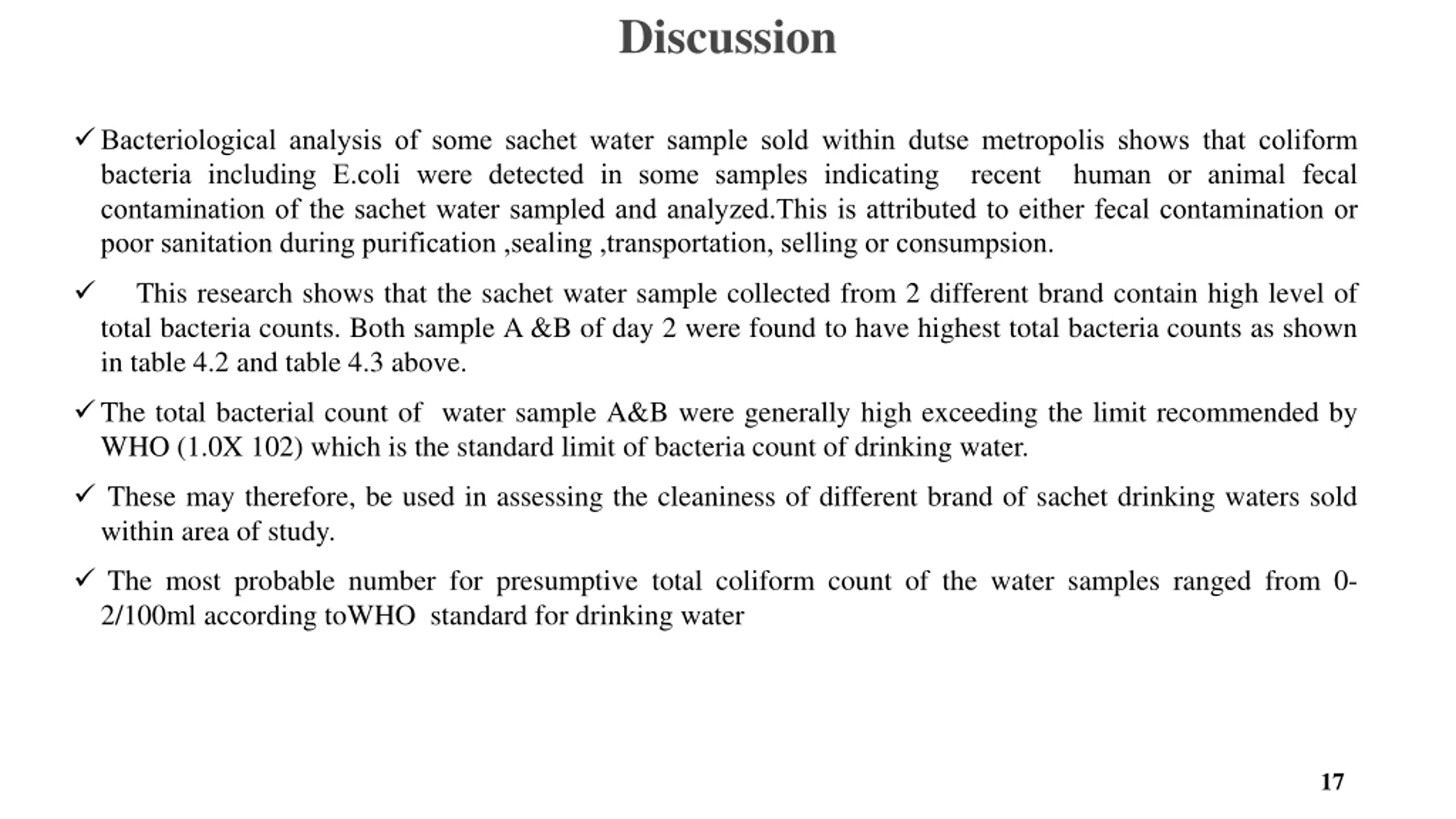Discussion cont., The isolated bacteria include:Escherichia coli, Pseudomonas, Proteus vulgaris ,Salmonella, Enterobacter aerogenes, Citrobacter and Klebsiella spp.presence of this organisms in water could cause the incidence of diarrhea, food poisoning and gastroenteritis among the society. According to World Health Organization (2002) report, a bacteria count concentration does not itself present a risk to human health. Nevertheless, bacteria counts are used as good indicators of the overall quality of production (Obiri et.al.,2003). The most probable number for presumptive total coliform count of the water samples ranged from 0-2/100ml according toWHO standard for drinking water.Water sample A &B had the highest coliform count of about 18MPN/100m as shown in table 4.4 and table 4.5, Bacteriological analysis of sachet water commonly sold in Dutse metropolis indicates the most of the sachet water did not meet the requirement of WHO standard for portable water which could be attributed to the bacterial contaminants that could have been introduced during the processing, packaging and distribution stages. 18