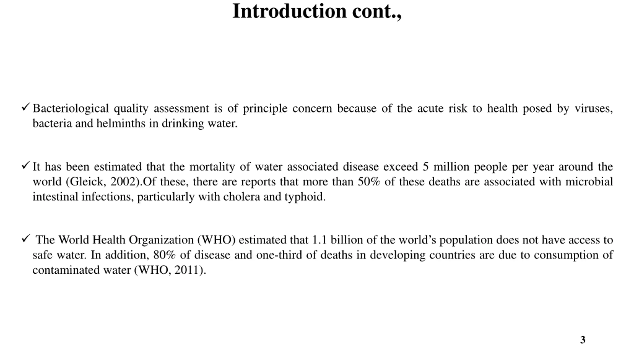Introduction cont., Bacteriological quality assessment is of principle concern because of the acute risk to health posed by viruses, bacteria and helminths in drinking water. It has been estimated that the mortality of water associated disease exceed 5 million people per year around the world (Gleick, 2002).Of these, there are reports that more than 50% of these deaths are associated with microbial intestinal infections, particularly with cholera and typhoid. The World Health Organization (WHO) estimated that 1.1 billion of the world s population does not have access to safe water. In addition, 80% of disease and one-third of deaths in developing countries are due to consumption of contaminated water (WHO, 2011). 3