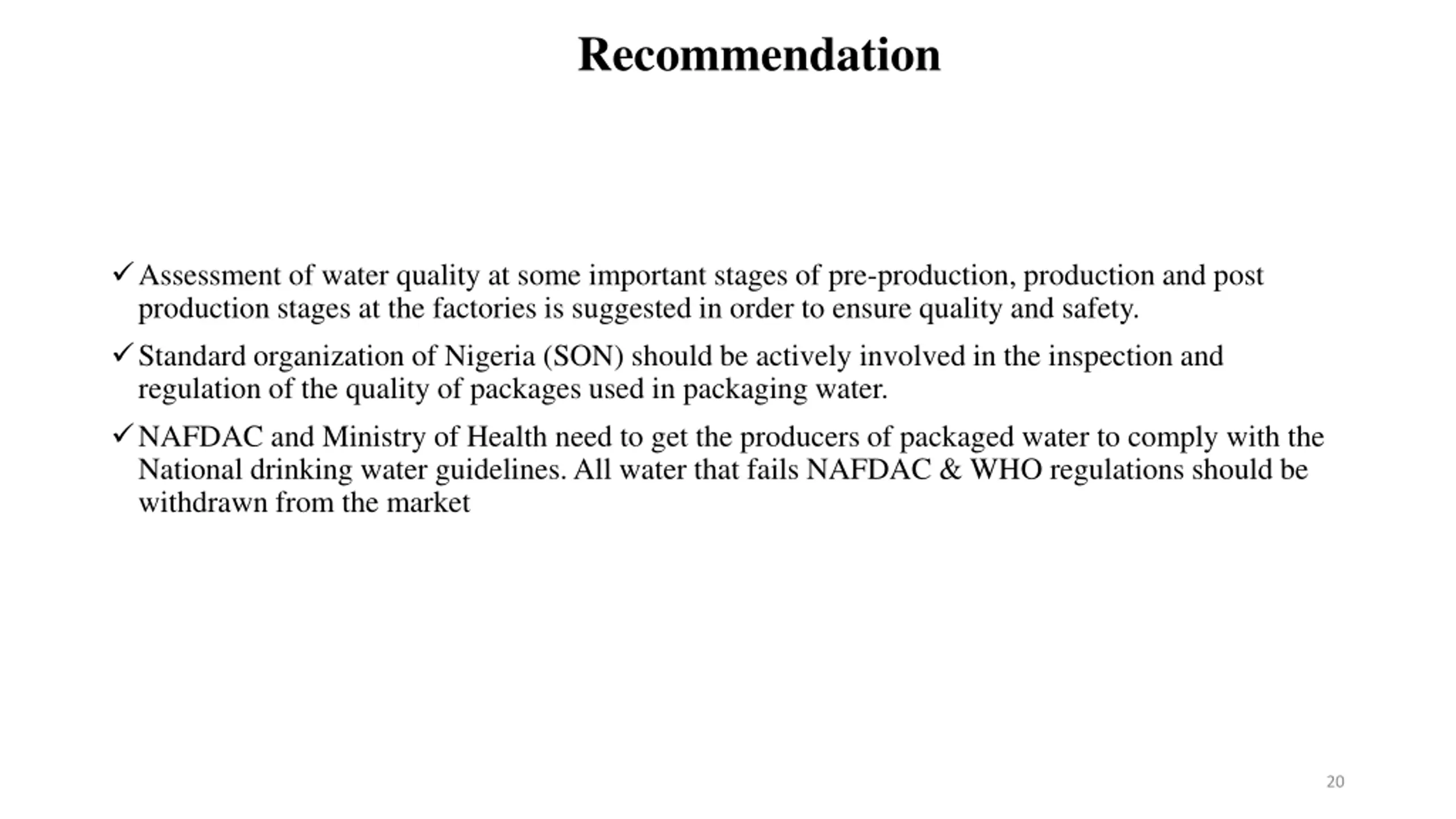Recommendation Assessment of water quality at some important stages of pre-production, production and post production stages at the factories is suggested in order to ensure quality and safety. Standard organization of Nigeria (SON) should be actively involved in the inspection and regulation of the quality of packages used in packaging water. NAFDAC and Ministry of Health need to get the producers of packaged water to comply with the National drinking water guidelines. All water that fails NAFDAC & WHO regulations should be withdrawn from the market 20