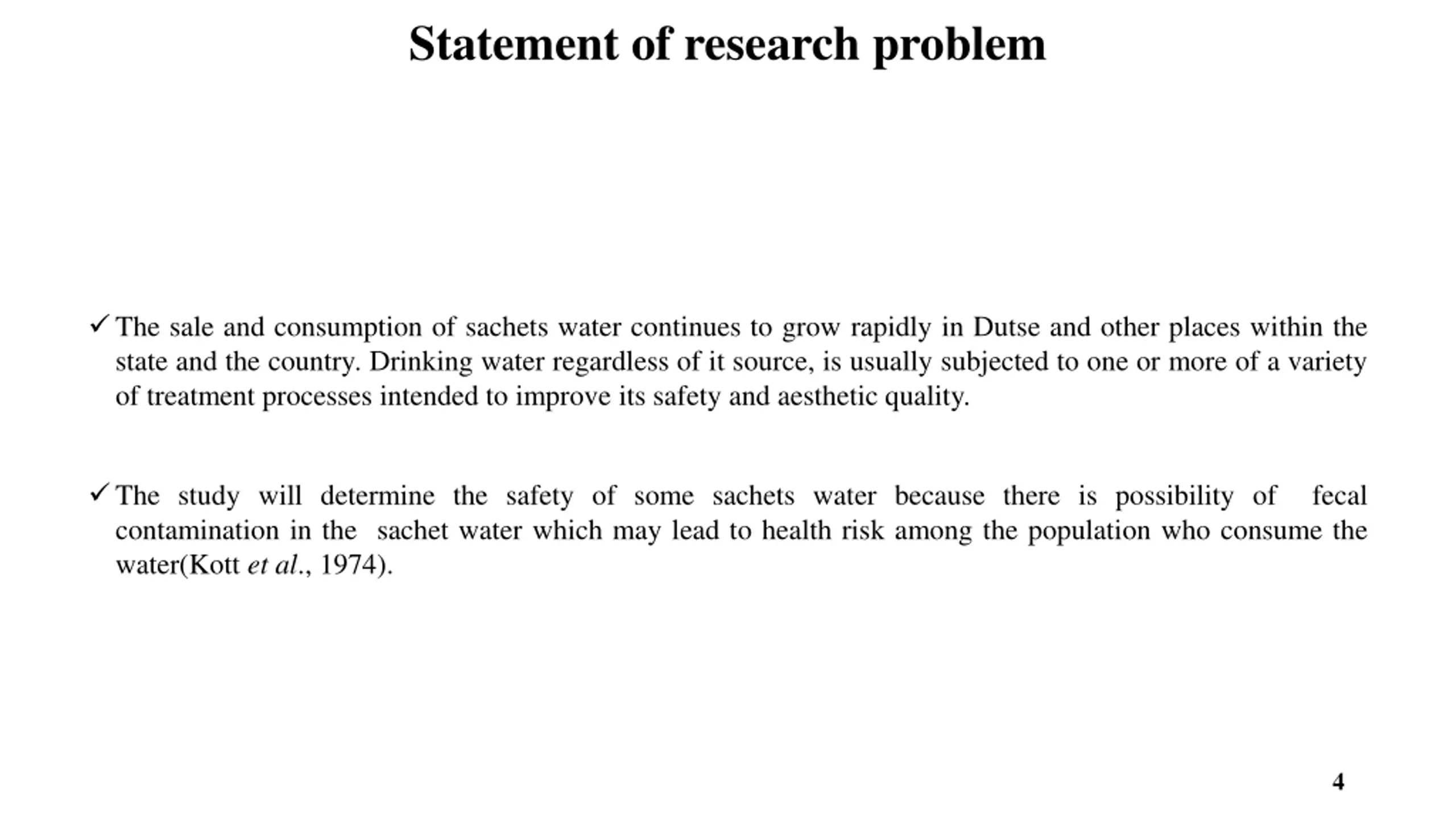 Statement of research problem The sale and consumption of sachets water continues to grow rapidly in Dutse and other places within the state and the country. Drinking water regardless of it source, is usually subjected to one or more of a variety of treatment processes intended to improve its safety and aesthetic quality. The study will determine the safety of some sachets water because there is possibility of fecal contamination in the sachet water which may lead to health risk among the population who consume the water(Kott etal., 1974). 4