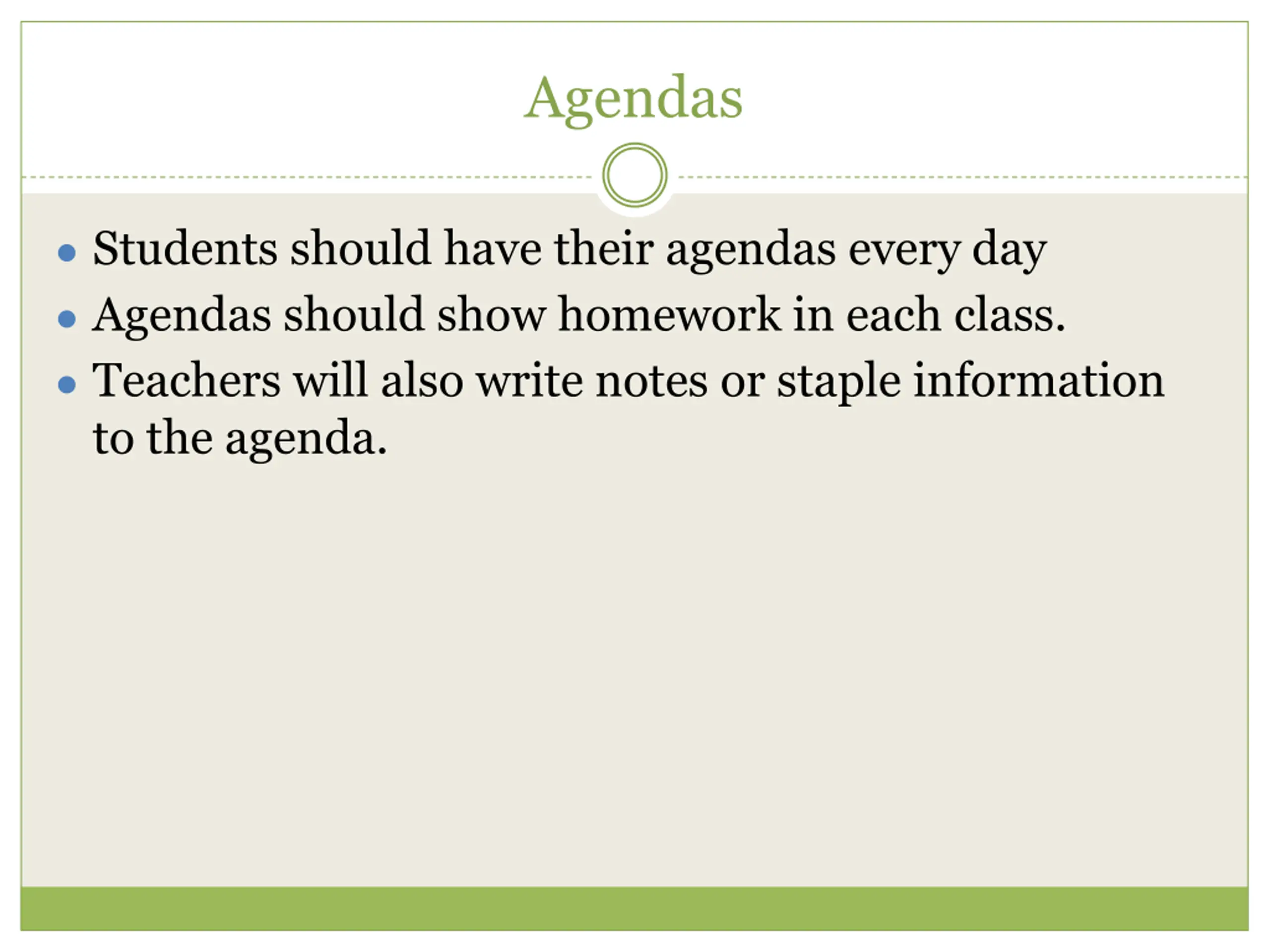 Agendas Students should have their agendas every day Agendas should show homework in each class. Teachers will also write notes or staple information to the agenda.