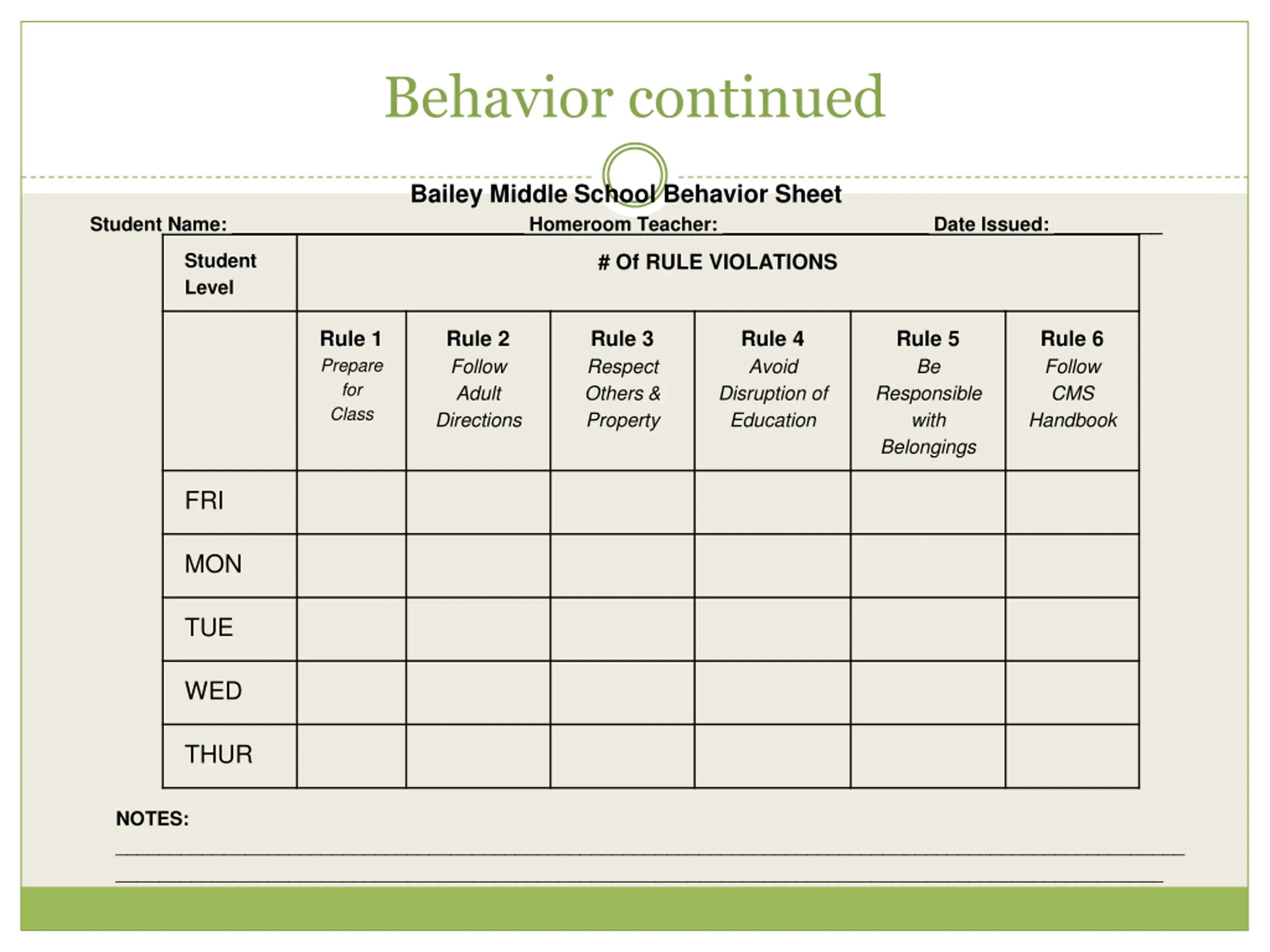 Behavior continued Bailey Middle School Behavior Sheet Student Name: ___________________________ Homeroom Teacher: ___________________ Date Issued: __________ Student Level # Of RULE VIOLATIONS Rule 1 Prepare for Class Rule 2 Follow Adult Directions Rule 3 Respect Others & Property Rule 4 Avoid Disruption of Education Rule 5 Be Responsible with Belongings Rule 6 Follow CMS Handbook FRI MON TUE WED THUR NOTES: ___________________________________________________________________________________________________ _________________________________________________________________________________________________