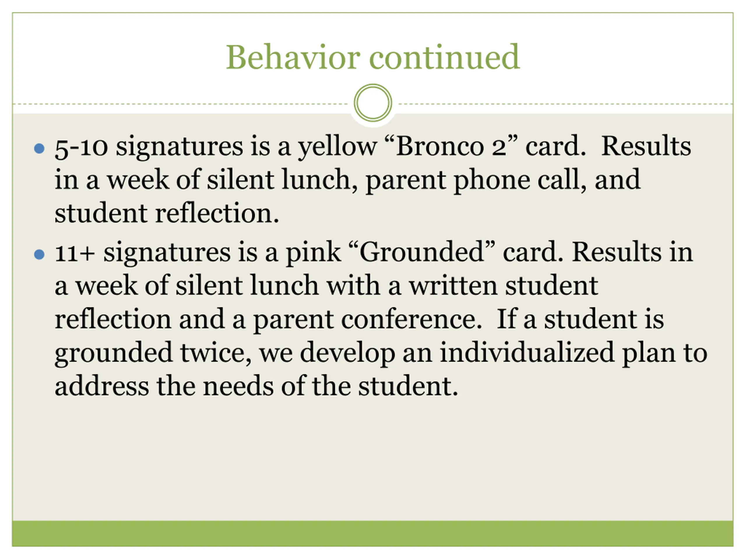 Behavior continued 5-10 signatures is a yellow Bronco 2 card. Results in a week of silent lunch, parent phone call, and student reflection. 11+ signatures is a pink Grounded card. Results in a week of silent lunch with a written student reflection and a parent conference. If a student is grounded twice, we develop an individualized plan to address the needs of the student.