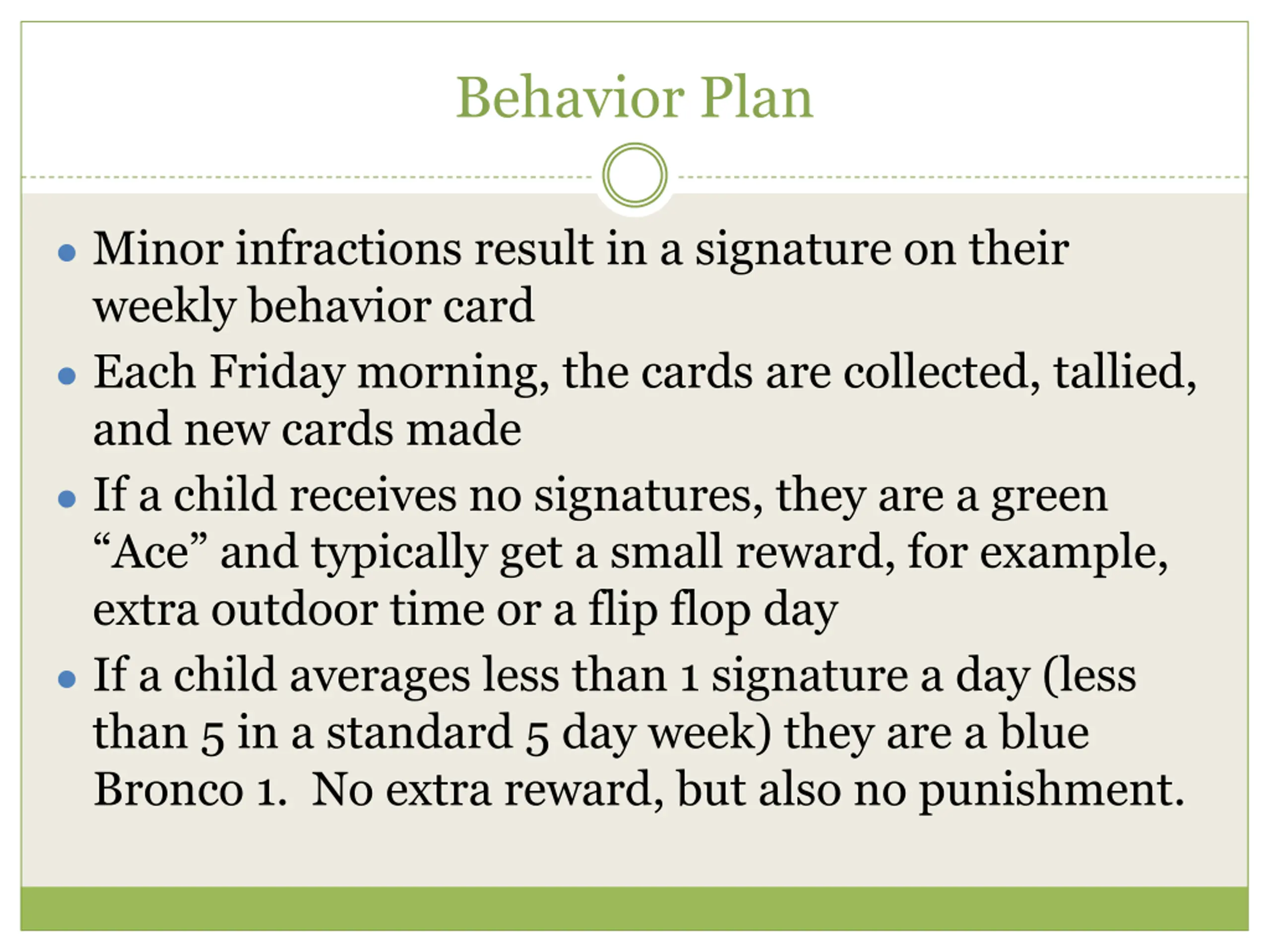 Behavior Plan Minor infractions result in a signature on their weekly behavior card Each Friday morning, the cards are collected, tallied, and new cards made If a child receives no signatures, they are a green Ace and typically get a small reward, for example, extra outdoor time or a flip flop day If a child averages less than 1 signature a day (less than 5 in a standard 5 day week) they are a blue Bronco 1. No extra reward, but also no punishment.
