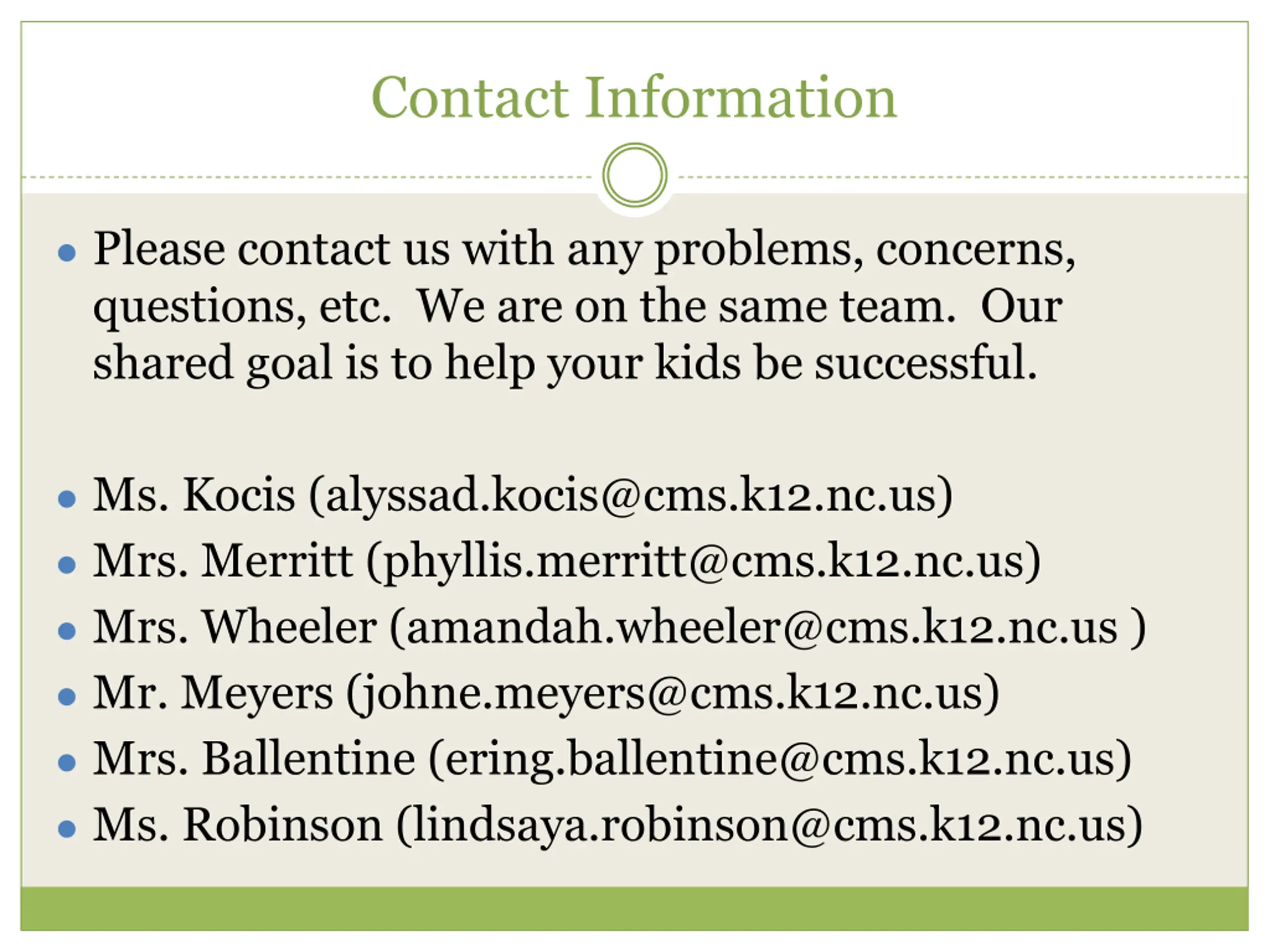 Contact Information Please contact us with any problems, concerns, questions, etc. We are on the same team. Our shared goal is to help your kids be successful. Ms. Kocis (alyssad.kocis@cms.k12.nc.us) Mrs. Merritt (phyllis.merritt@cms.k12.nc.us) Mrs. Wheeler (amandah.wheeler@cms.k12.nc.us ) Mr. Meyers (johne.meyers@cms.k12.nc.us) Mrs. Ballentine (ering.ballentine@cms.k12.nc.us) Ms. Robinson (lindsaya.robinson@cms.k12.nc.us)