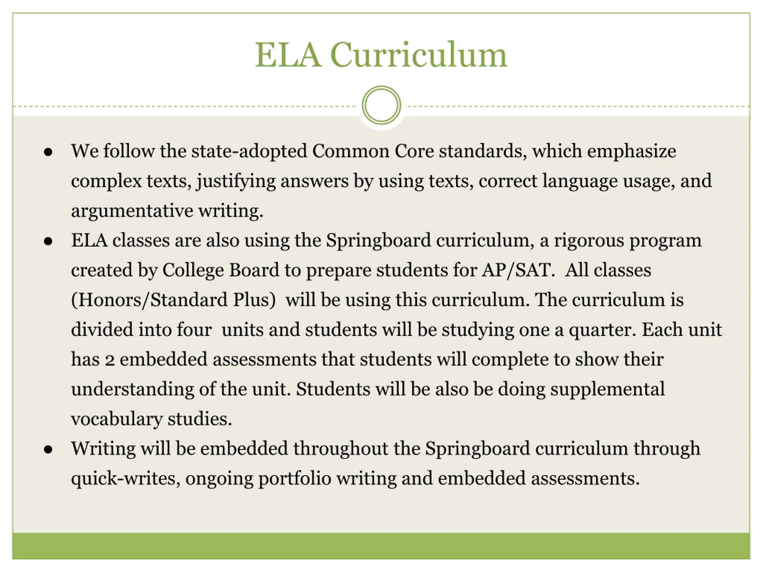 ELA Curriculum We follow the state-adopted Common Core standards, which emphasize complex texts, justifying answers by using texts, correct language usage, and argumentative writing. ELA classes are also using the Springboard curriculum, a rigorous program created by College Board to prepare students for AP/SAT. All classes (Honors/Standard Plus) will be using this curriculum. The curriculum is divided into four units and students will be studying one a quarter. Each unit has 2 embedded assessments that students will complete to show their understanding of the unit. Students will be also be doing supplemental vocabulary studies. Writing will be embedded throughout the Springboard curriculum through quick-writes, ongoing portfolio writing and embedded assessments.