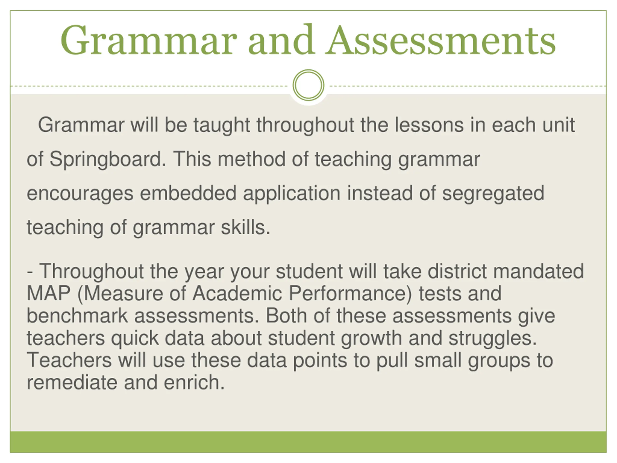 Grammar and Assessments Grammar will be taught throughout the lessons in each unit of Springboard. This method of teaching grammar encourages embedded application instead of segregated teaching of grammar skills. - Throughout the year your student will take district mandated MAP (Measure of Academic Performance) tests and benchmark assessments. Both of these assessments give teachers quick data about student growth and struggles. Teachers will use these data points to pull small groups to remediate and enrich.