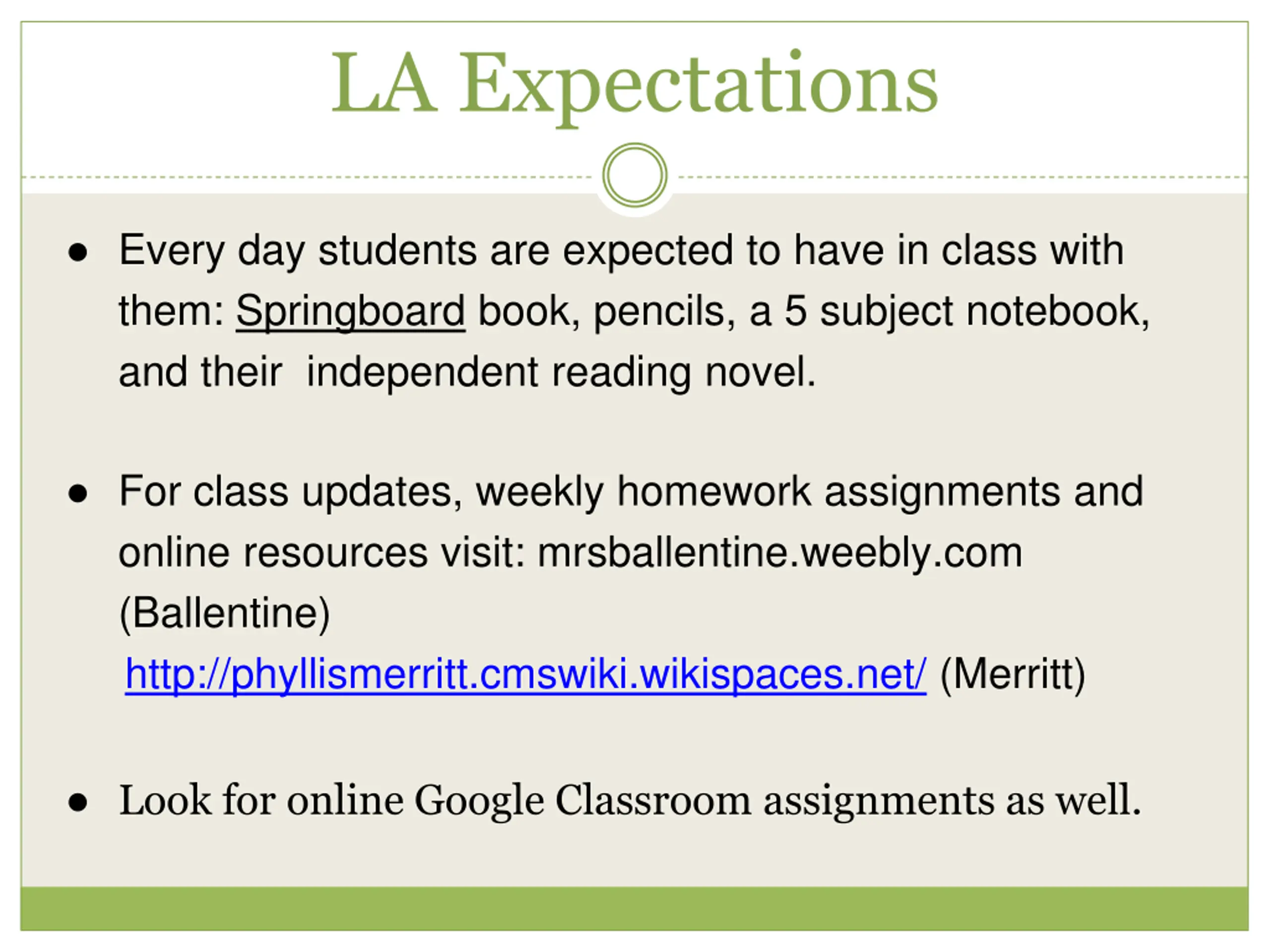 LA Expectations Every day students are expected to have in class with them: Springboard book, pencils, a 5 subject notebook, and their independent reading novel. For class updates, weekly homework assignments and online resources visit: mrsballentine.weebly.com (Ballentine) http://phyllismerritt.cmswiki.wikispaces.net/ (Merritt) Look for online Google Classroom assignments as well.