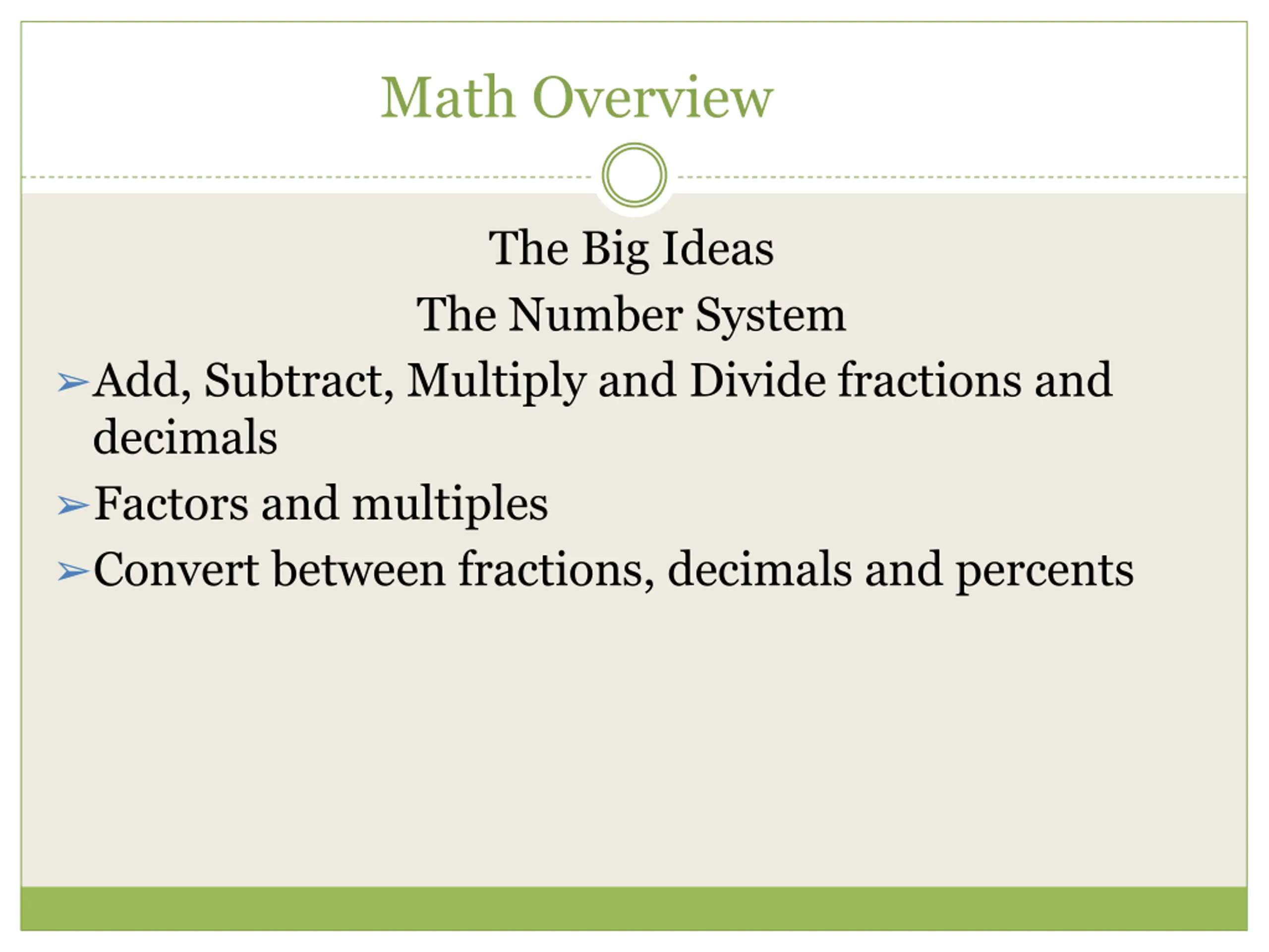 Math Overview The Big Ideas The Number System Add, Subtract, Multiply and Divide fractions and decimals Factors and multiples Convert between fractions, decimals and percents