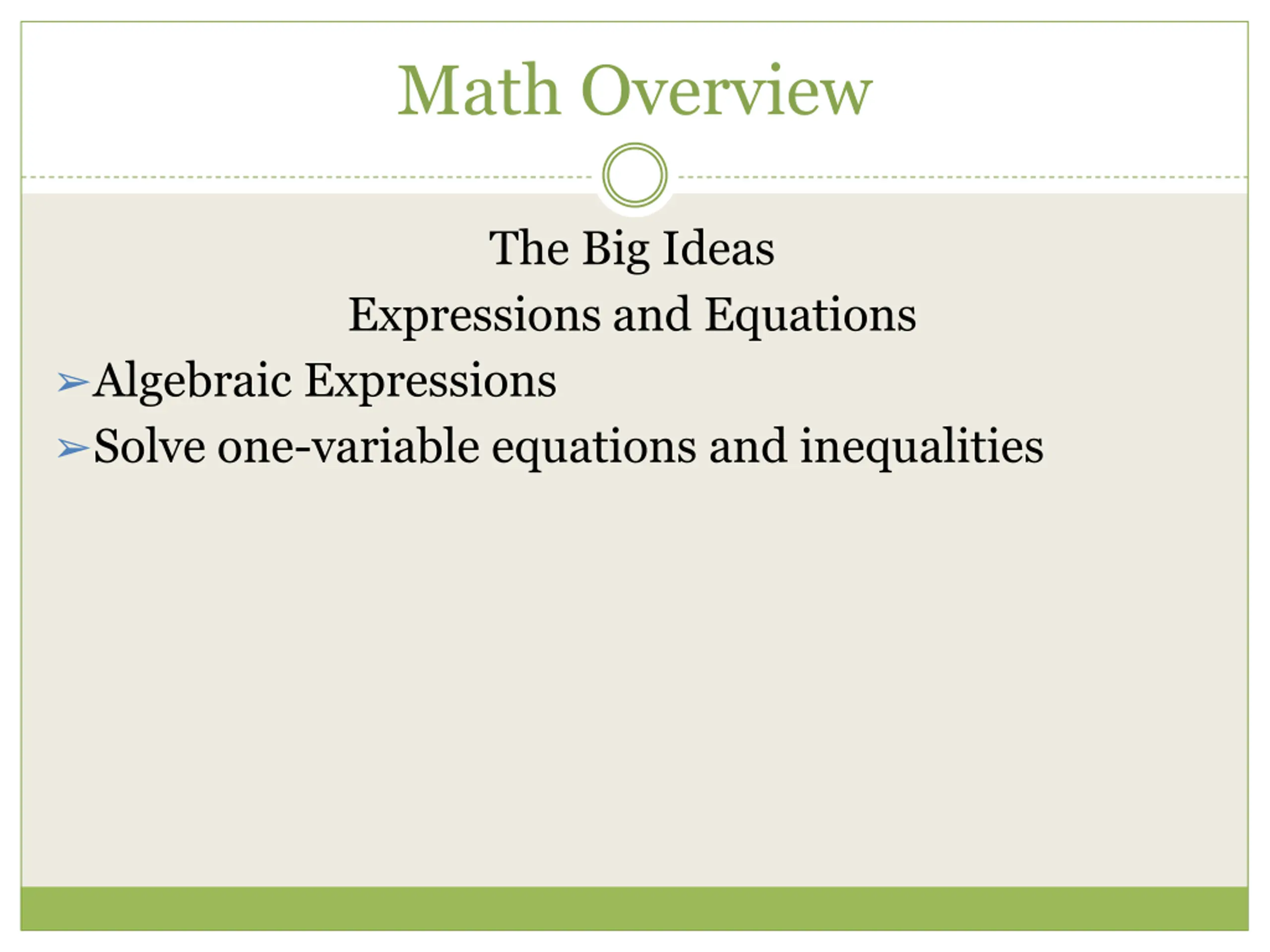 Math Overview The Big Ideas Expressions and Equations Algebraic Expressions Solve one-variable equations and inequalities