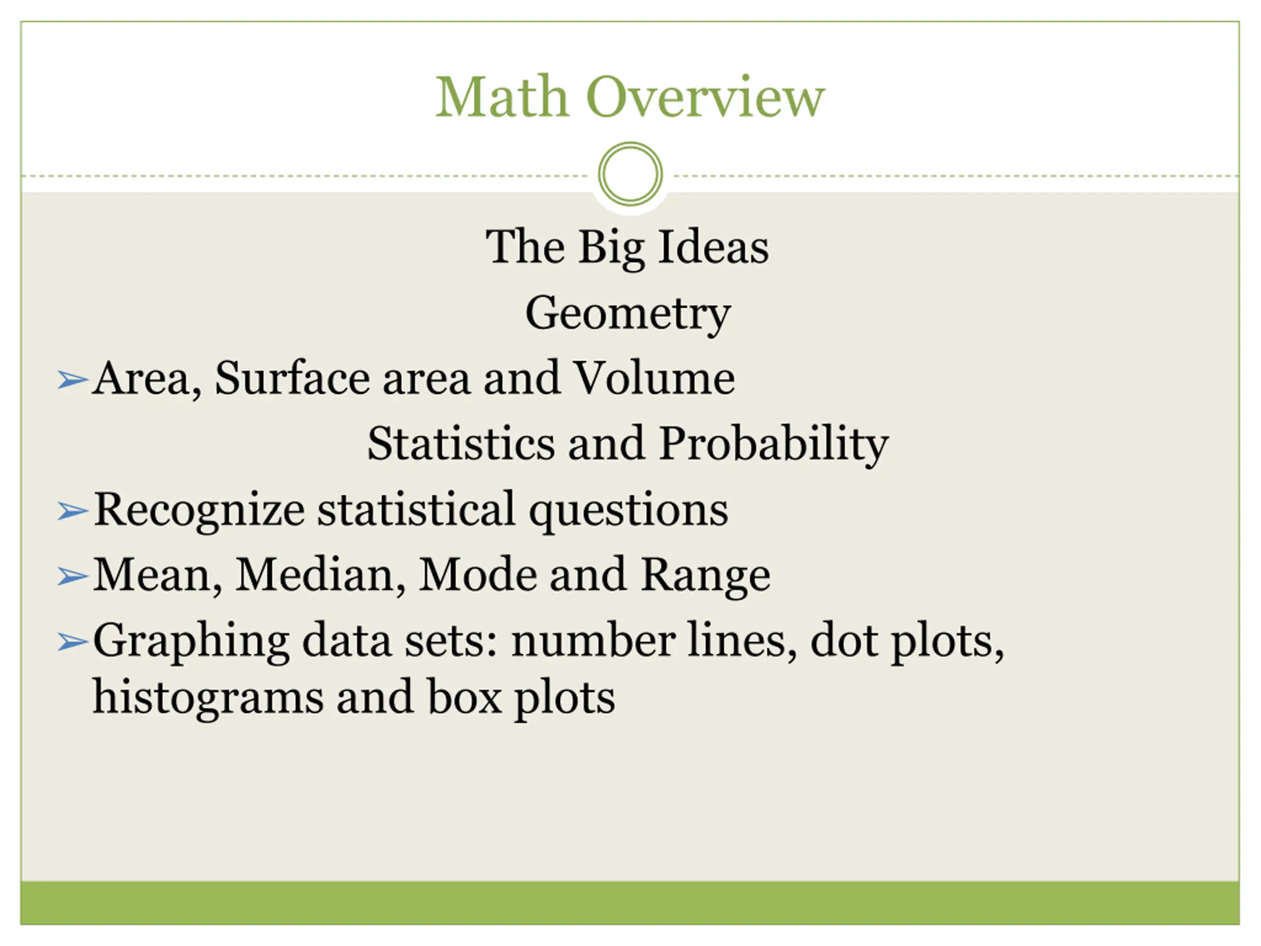 Math Overview The Big Ideas Geometry Area, Surface area and Volume Statistics and Probability Recognize statistical questions Mean, Median, Mode and Range Graphing data sets: number lines, dot plots, histograms and box plots