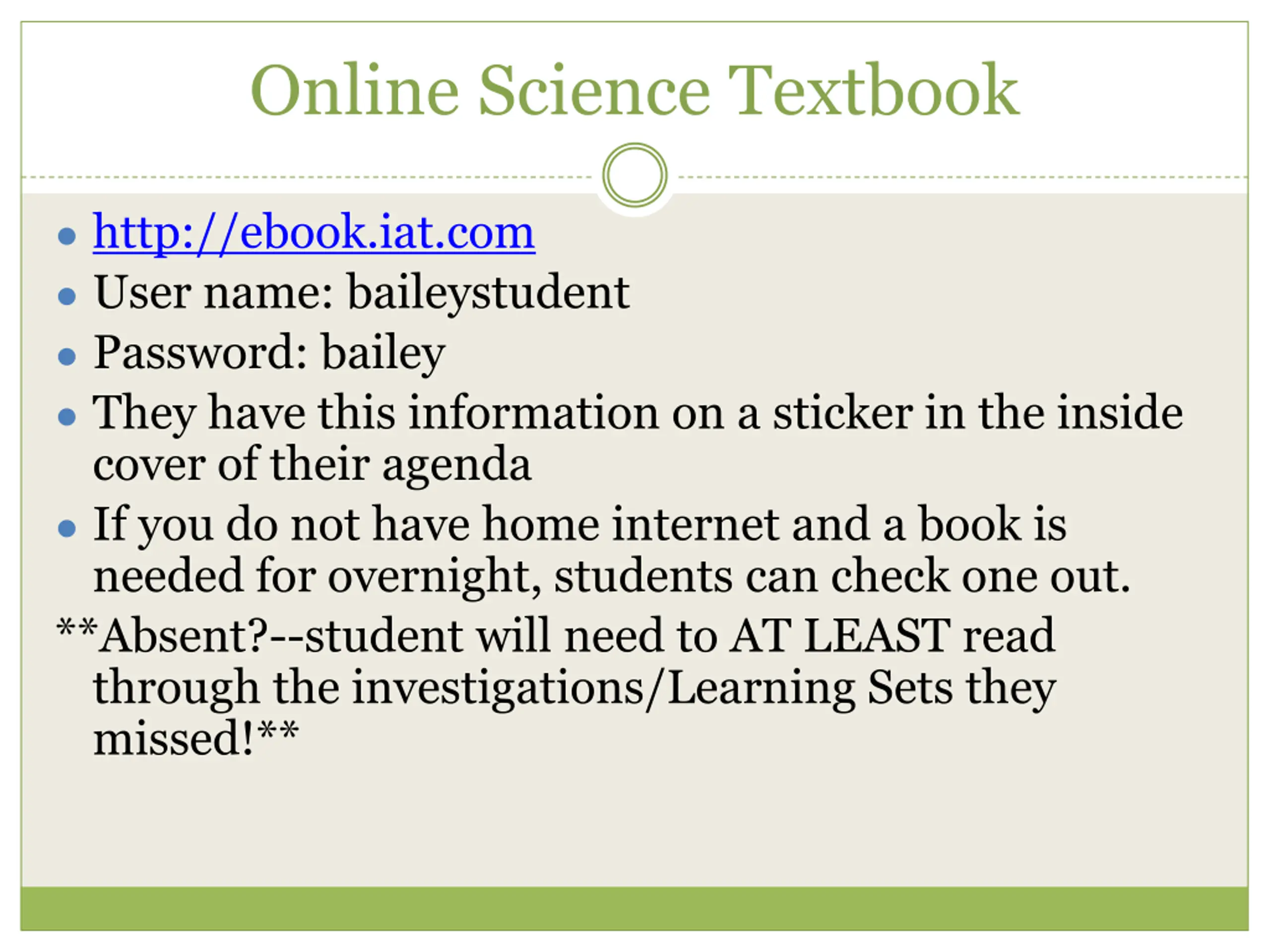 Online Science Textbook http://ebook.iat.com User name: baileystudent Password: bailey They have this information on a sticker in the inside cover of their agenda If you do not have home internet and a book is needed for overnight, students can check one out. **Absent?--student will need to AT LEAST read through the investigations/Learning Sets they missed!**