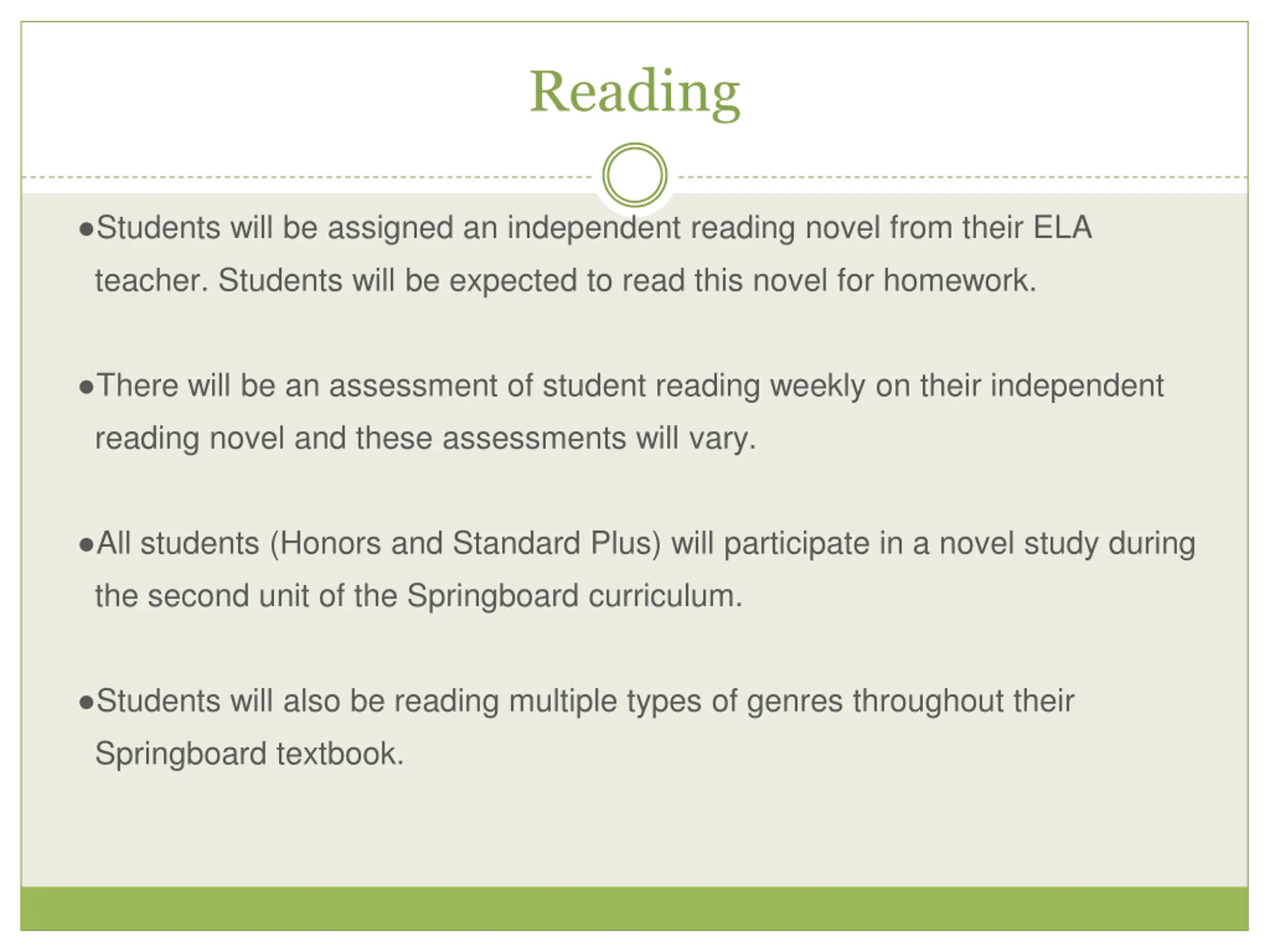 Reading Students will be assigned an independent reading novel from their ELA teacher. Students will be expected to read this novel for homework. There will be an assessment of student reading weekly on their independent reading novel and these assessments will vary. All students (Honors and Standard Plus) will participate in a novel study during the second unit of the Springboard curriculum. Students will also be reading multiple types of genres throughout their Springboard textbook.