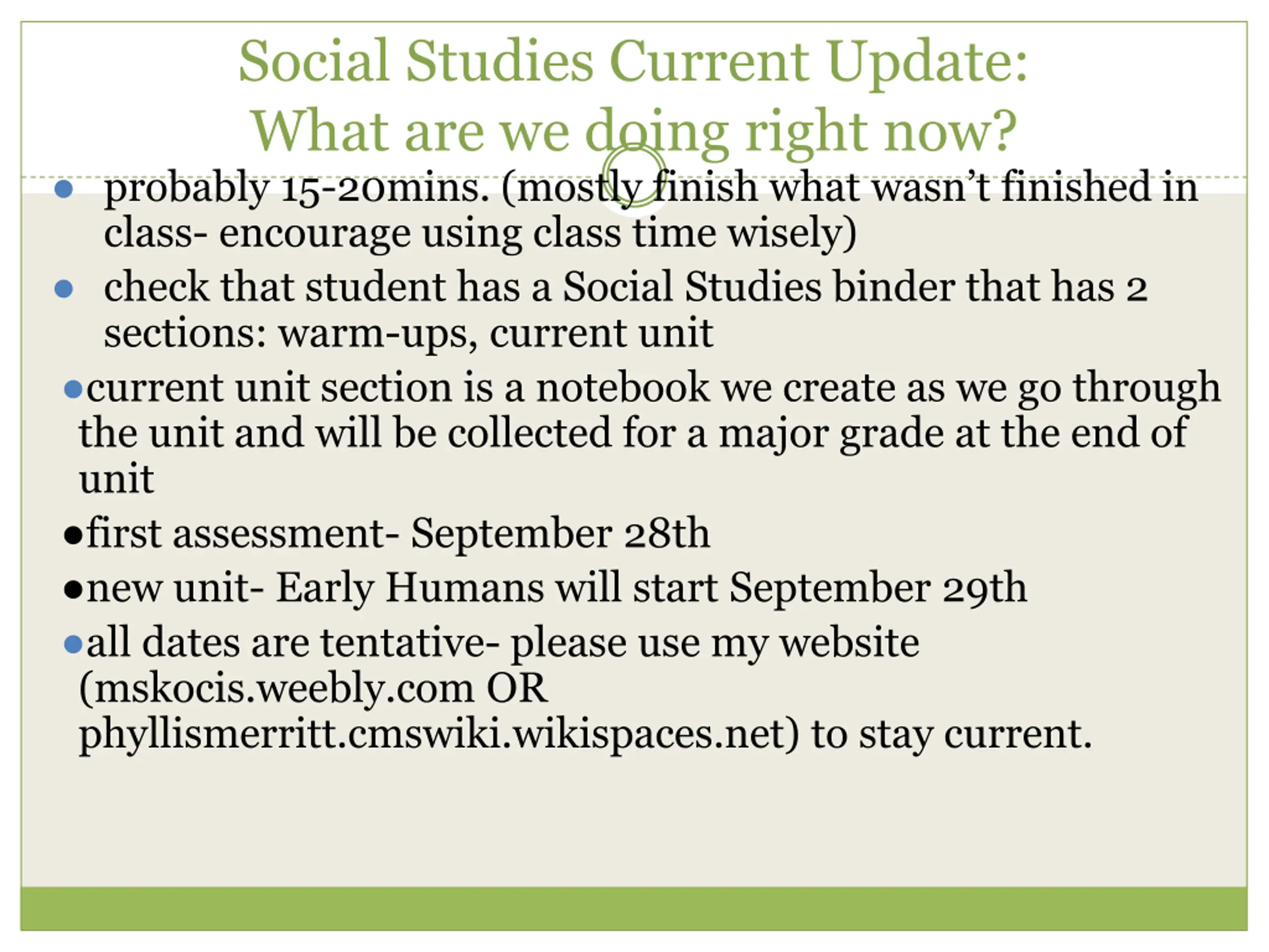 Social Studies Current Update: What are we doing right now? probably 15-20mins. (mostly finish what wasn t finished in class- encourage using class time wisely) check that student has a Social Studies binder that has 2 sections: warm-ups, current unit current unit section is a notebook we create as we go through the unit and will be collected for a major grade at the end of unit first assessment- September 28th new unit- Early Humans will start September 29th all dates are tentative- please use my website (mskocis.weebly.com OR phyllismerritt.cmswiki.wikispaces.net) to stay current.