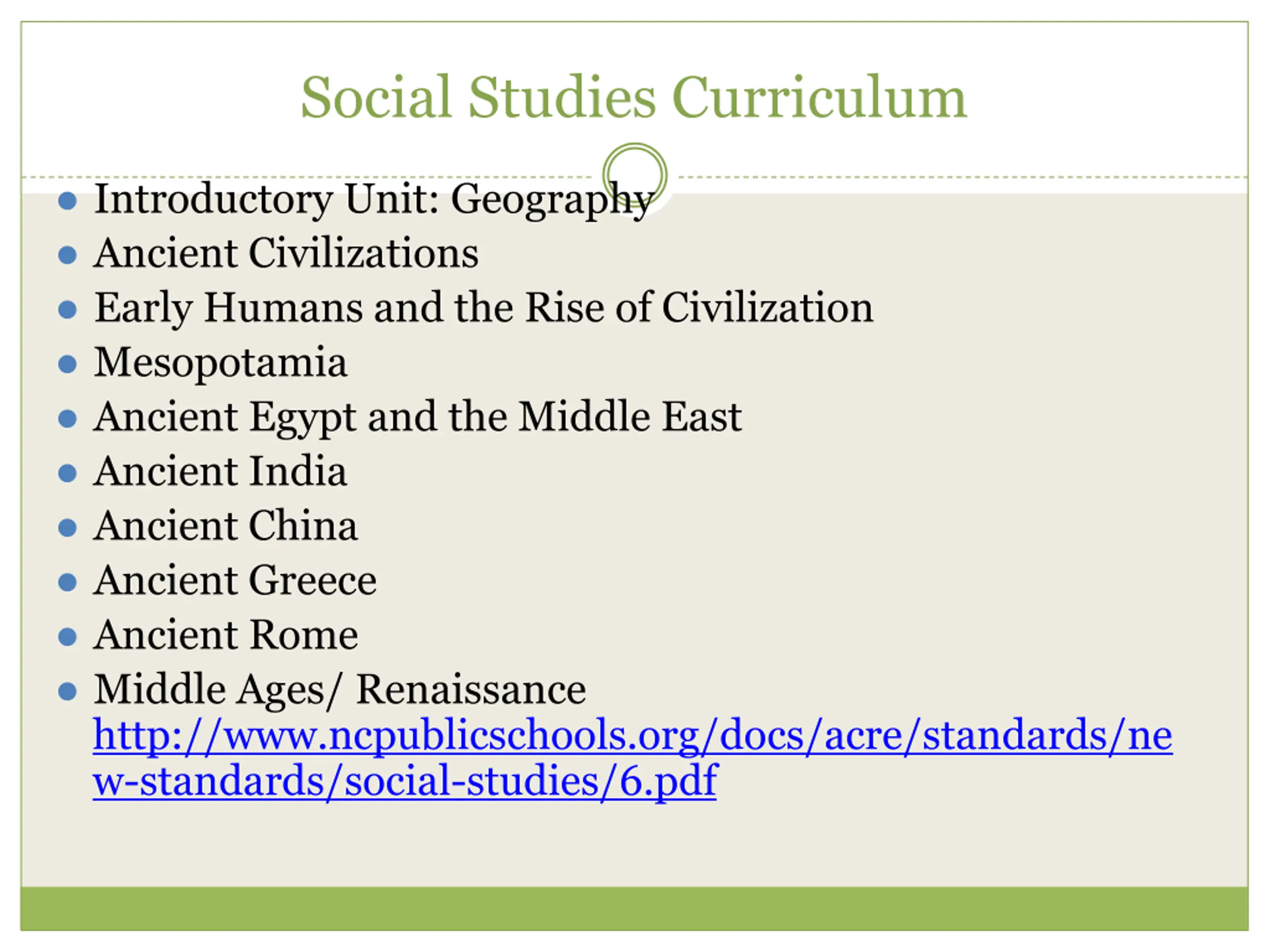 Social Studies Curriculum Introductory Unit: Geography Ancient Civilizations Early Humans and the Rise of Civilization Mesopotamia Ancient Egypt and the Middle East Ancient India Ancient China Ancient Greece Ancient Rome Middle Ages/ Renaissance http://www.ncpublicschools.org/docs/acre/standards/ne w-standards/social-studies/6.pdf