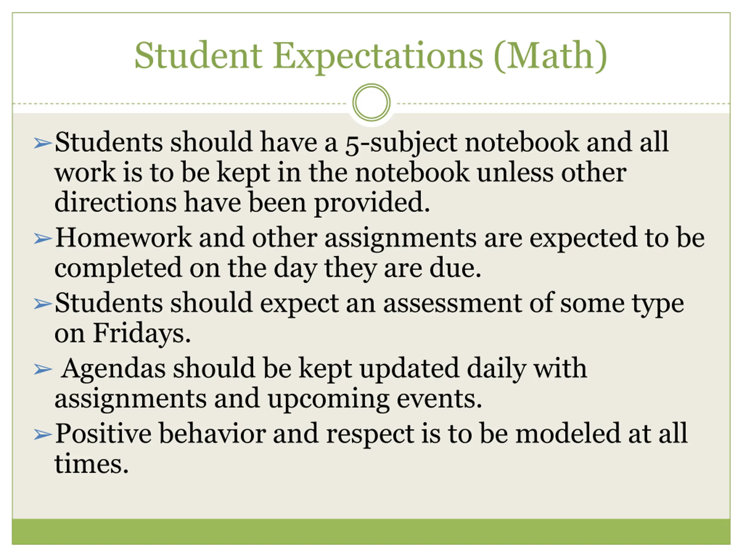 Student Expectations (Math) Students should have a 5-subject notebook and all work is to be kept in the notebook unless other directions have been provided. Homework and other assignments are expected to be completed on the day they are due. Students should expect an assessment of some type on Fridays. Agendas should be kept updated daily with assignments and upcoming events. Positive behavior and respect is to be modeled at all times.